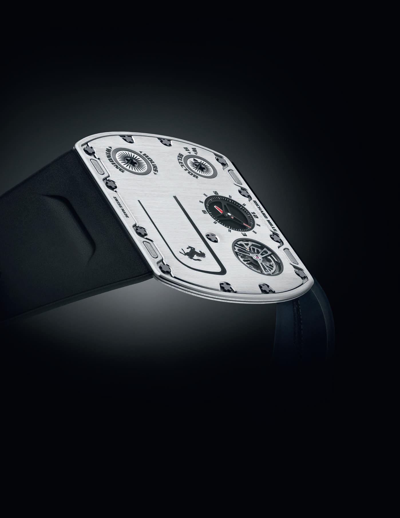 RM UP-01 FERRARI Ultra-flat manual winding calibre 1.75 millimetres thin 45-hour power reserve (± 10%) Baseplate, bridges and case in grade 5 titanium Patented ultra-flat escapement Function selector Limited edition of 150 pieces A Racing Machine On The Wrist
