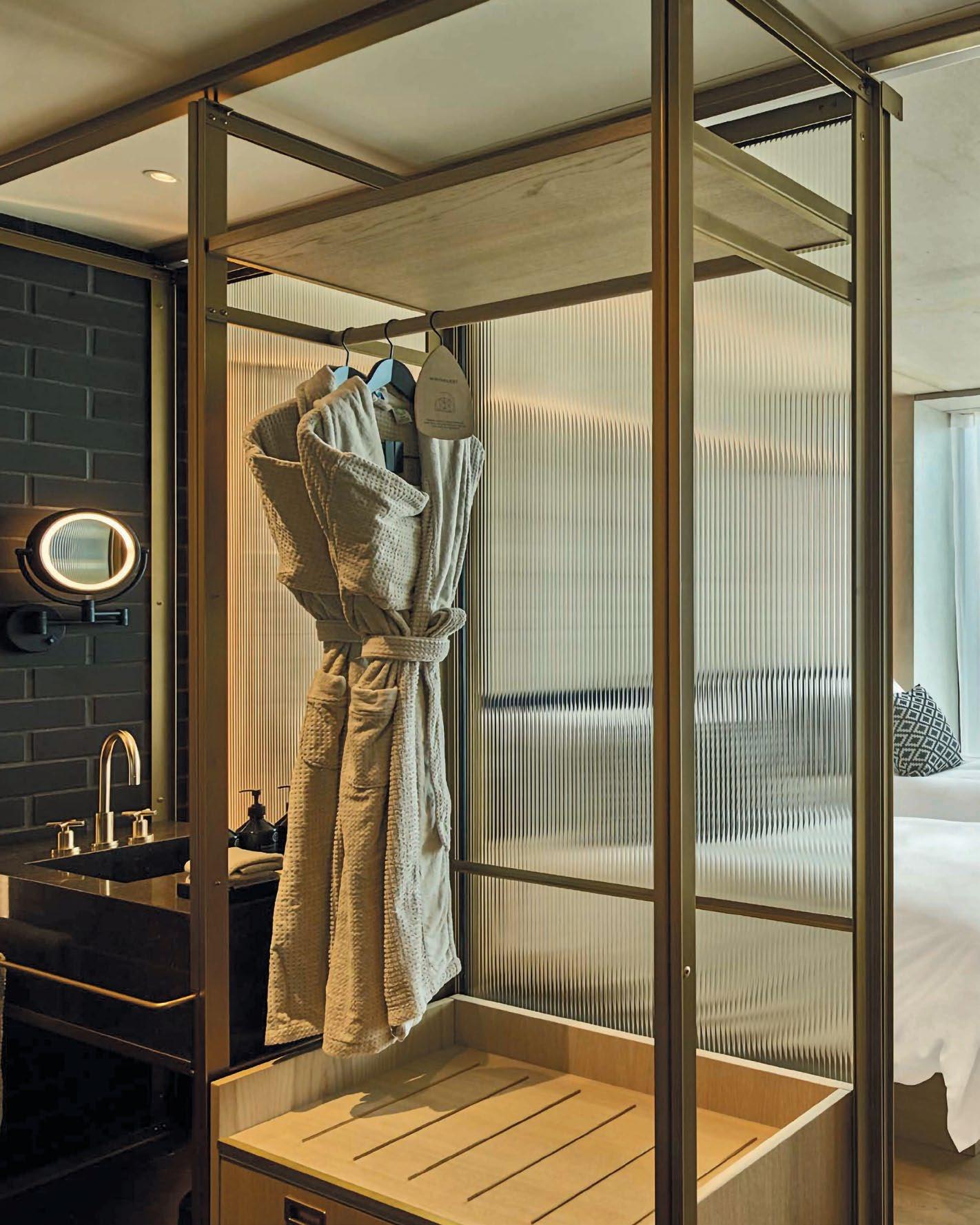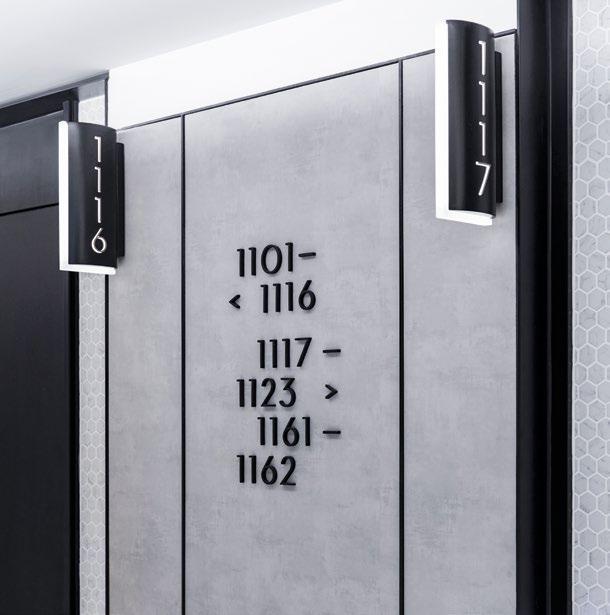 TOP: Industrial-inspired signage directs the guests to their rooms