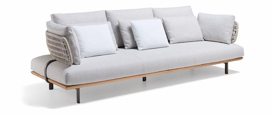 Sway sofa is a testament to outdoor luxury, blending nature-inspired design with modular innovation. Fashioned from solid teak, the Sway sofa features fluid lines and versatile elements. The woven backrest, in teak or olive-green EVA polyurethane, exudes Mediterranean ease. With weather-resistant cushions and customisable configurations, Sway beckons endless relaxation. Imbued with a sense of understated sumptuousness, Sway’s design intertwines art with technology, taking outdoor living to the next level.