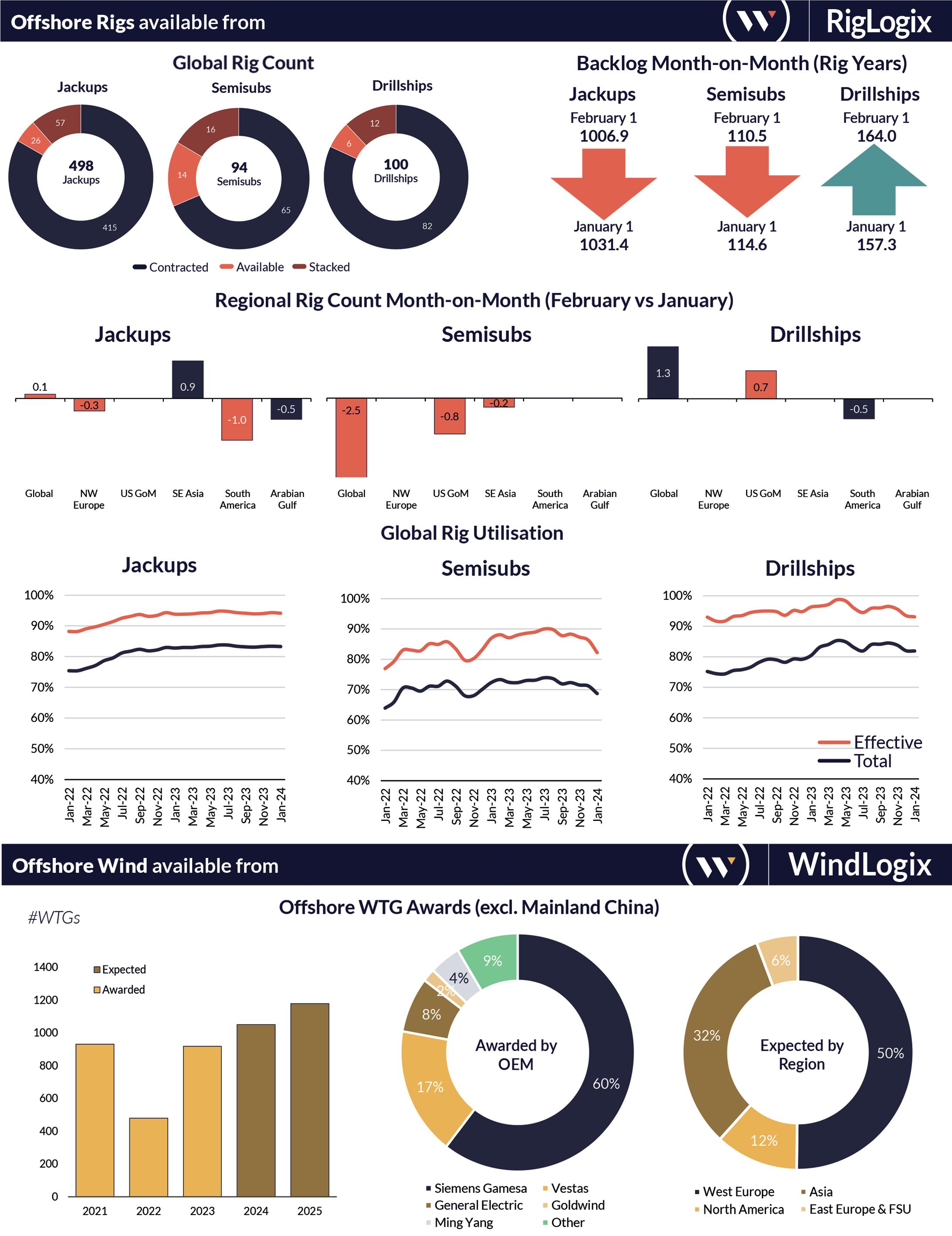 The global committed jackup count averaged 415 units in January. Marketed available and cold-stacked jackup counts now stand at 26 and 57 respectively, with marketed committed utilisation and total utilisation at 94% and 83% respectively. During the month, a total of 13 contracts were awarded, amounting to 4,367 days (12.0 rig years) of backlog added. Of these contracts, 46% were awards for drilling activities in the North Sea.