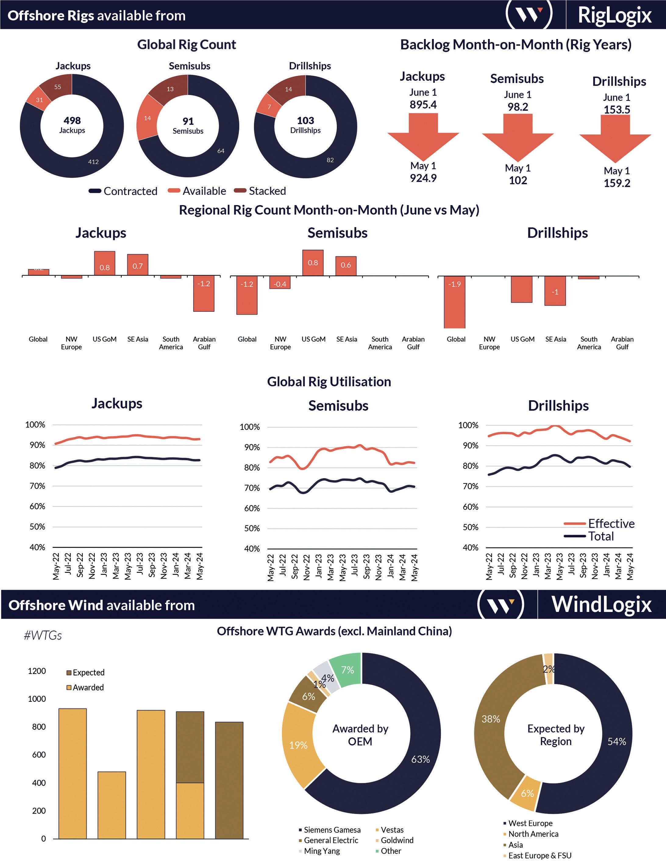 Finally, the global drillship count sustained at 84 units during the month, leaving six marketed rigs available plus 13 cold-stacked units. Marketed and total committed utilisation dipped to 92% and 80%, respectively. The two-year option for Ocean BlackHawk was exercised by Diamond Offshore for work in the US Gulf. The contract will begin in November 2024 in direct continuation of current charter.