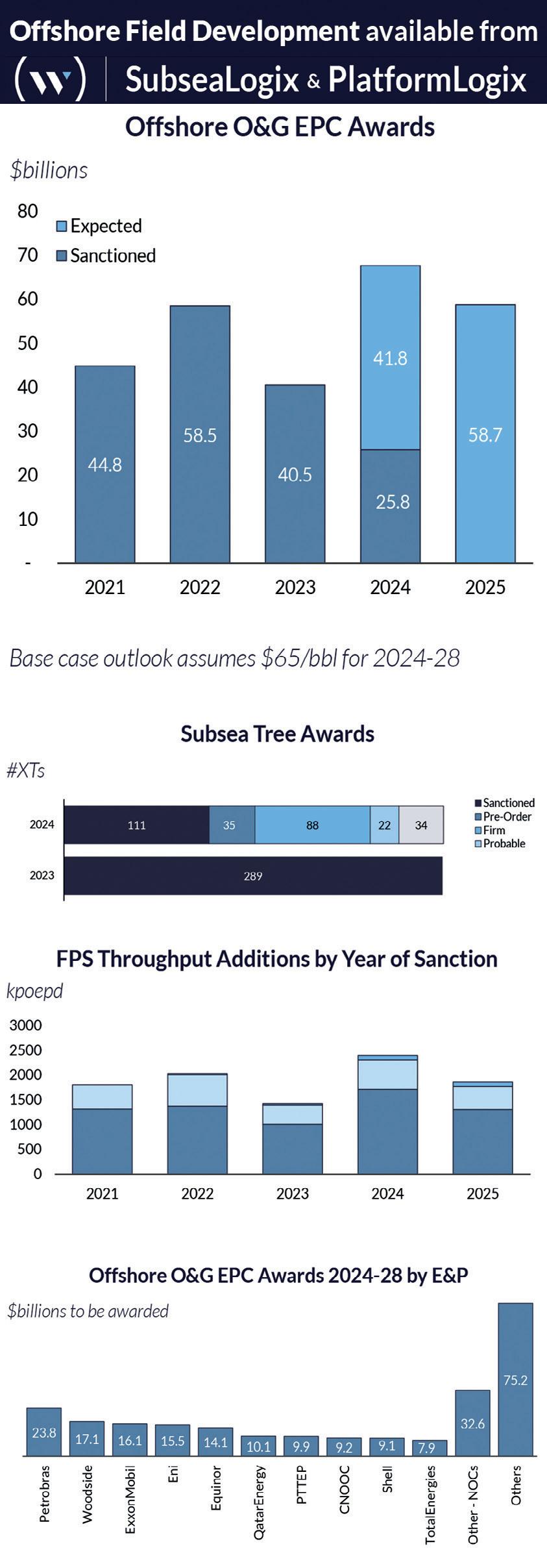 Offshore Vietnam, PTSC Mechanical & Construction (PTSC M&C), a subsidiary of Petrovietnam Technical Services Corporation (PTSC), was awarded a contract relating to the production platform at Murphy's Lac Da Vang field. PTSC M&C will be responsible for project management, detailed engineering, procurement, construction, transportation, installation, hook-up and commissioning of the central platform, with topsides weighing over 6,000 metric tonnes and substructures over 5,000 metric tonnes. Another major contract awarded during the period under review is the award to Subsea 7 for the engineering, procurement, fabrication, installation and pre-commissioning of 102km of rigid risers and flowlines for the steel lazy wave production system for Petrobras' Buzios-9 development offshore Brazil. Oceaneering also secured a contract from Petrobras to supply up to 362km of steel tube and thermoplastic electro-hydraulic (EH) umbilicals and associated subsea distribution hardware for use in projects offshore Brazil. Looking forward, Westwood forecasts an additional US$42 billion of offshore O&Grelated EPC spend for the remainder of 2024, given the FID timeline for TotalEnergies' Block 58 project offshore Suriname has been revised to 4Q 2024 in addition to other key projects such as BP's Kaskida field (US), QatarEnergy's North Field Compression Project – Phase I (Qatar), PTTEP's Lang Lebah development (Malaysia) and ADNOC's Umm Shaif Long Term Development – Phase II project offshore the UAE.