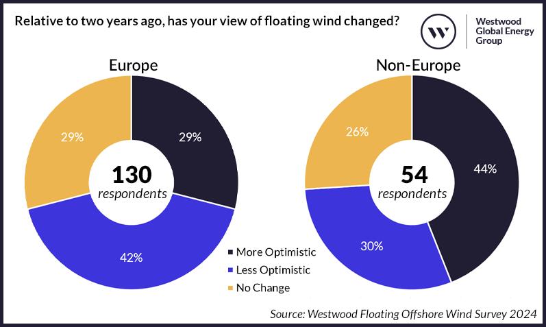 General consensus deviates when it comes to the question of optimism, relative to the highs of two years ago. On balance there is a more positive picture around sentiment than a lot of the headlines suggest. While optimism has waned, 62% of respondents have either maintained their optimism or are more positive about the industry. There are regional nuances to this, with 42% of European respondents less optimistic about the floating offshore wind sector, compared with 30% for non-Europe respondents.