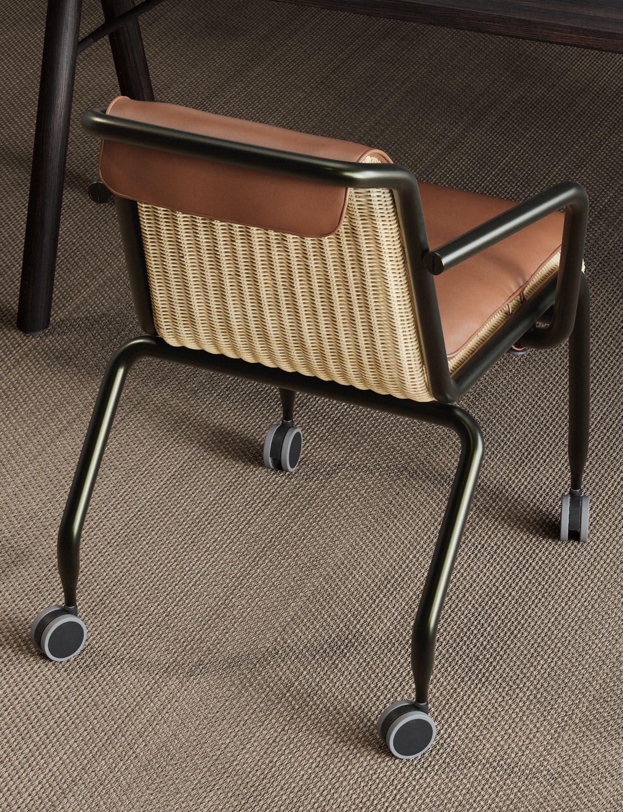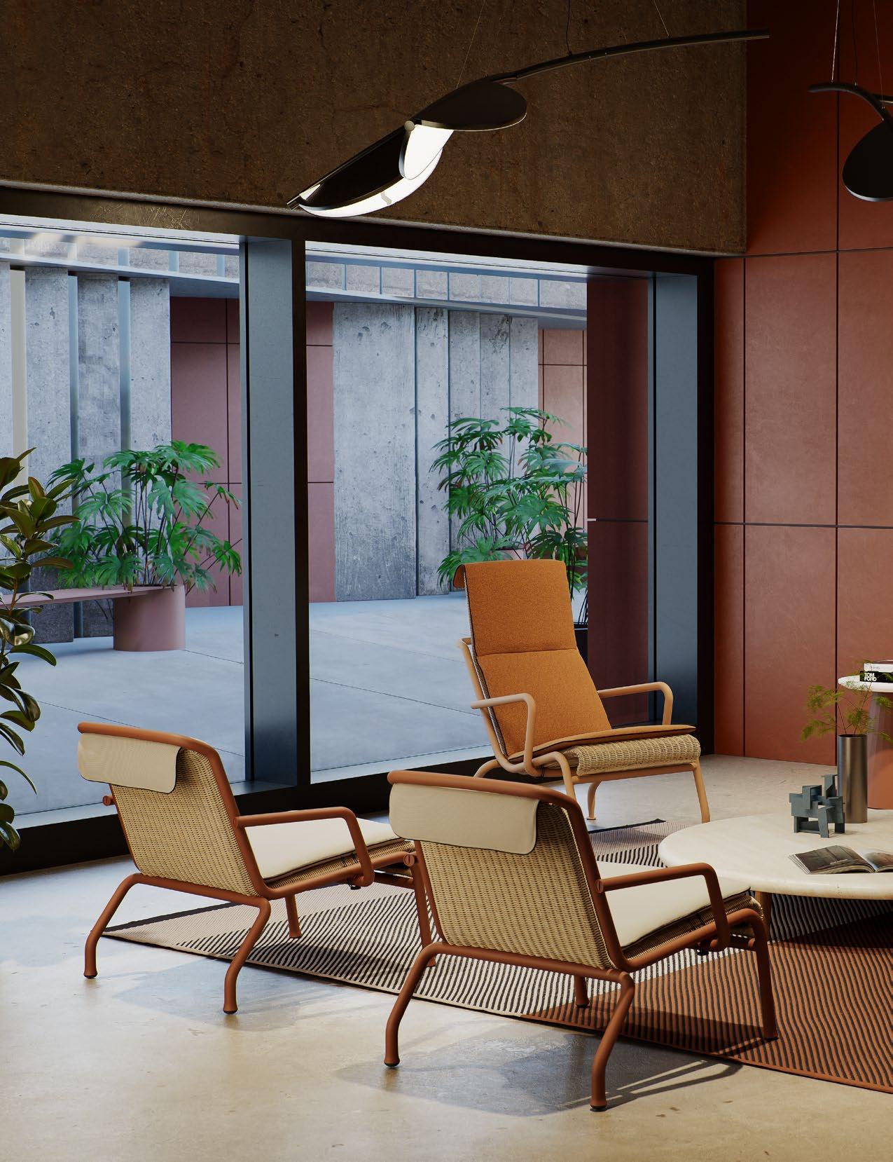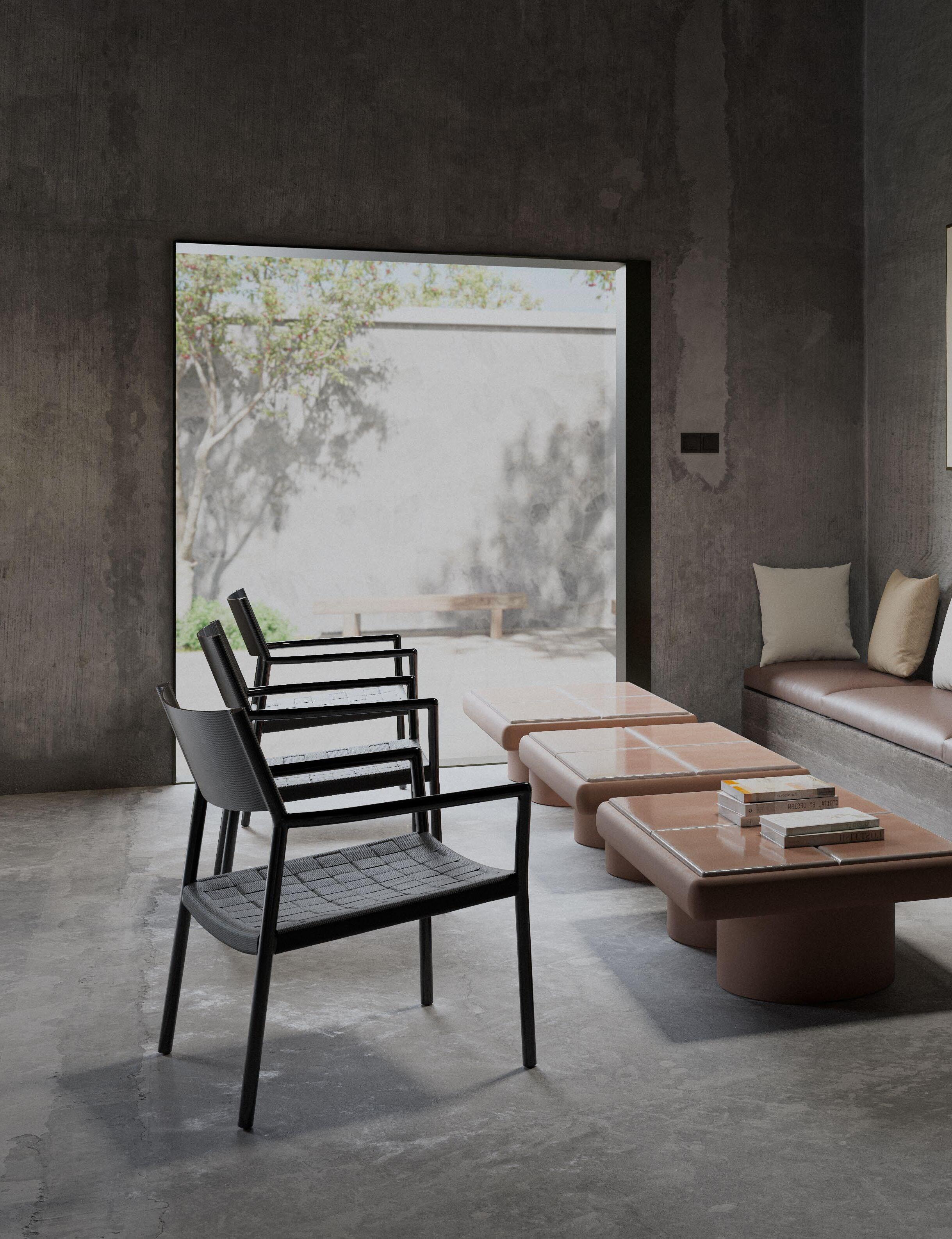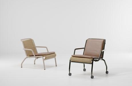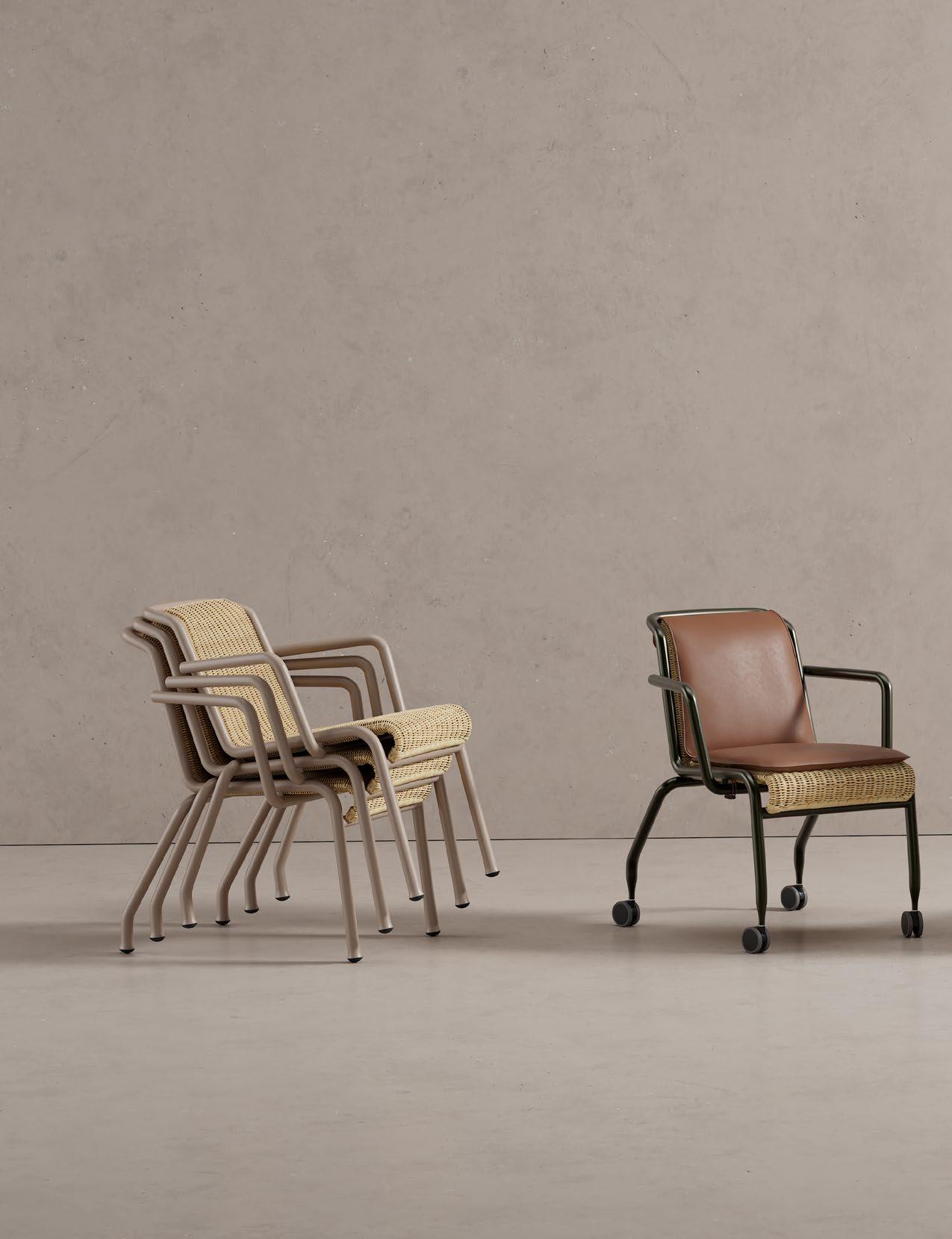 One of the collection’s highlights is the Eolias Salinas series, which features a chair, club chair, and club lounge chair made from sturdy aluminum with a woven wicker detail. These pieces come in both indoor and outdoor versions, with the indoor chairs available with or without wheels for added convenience.