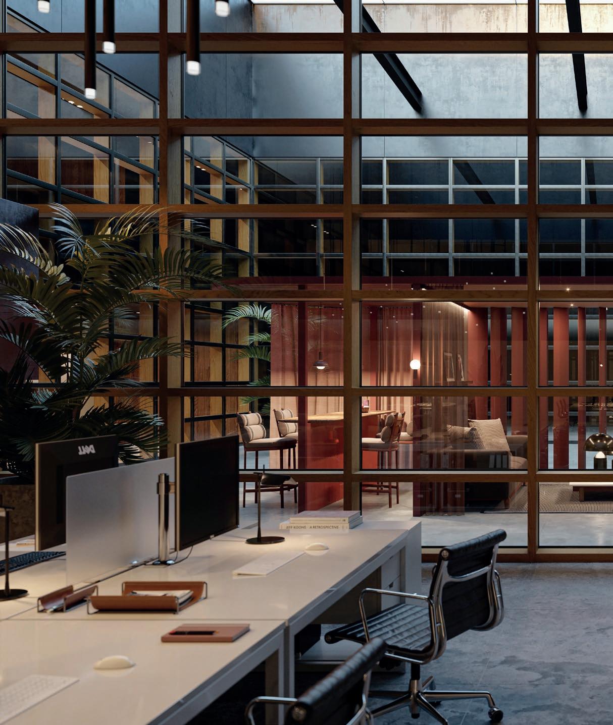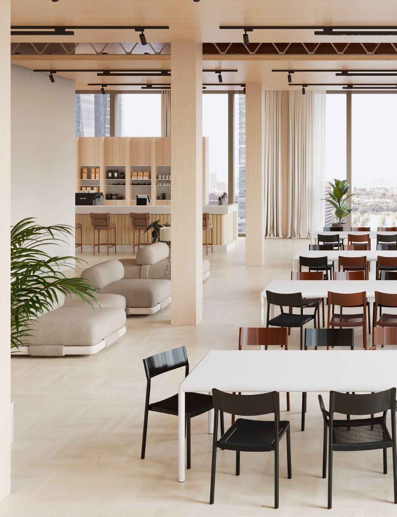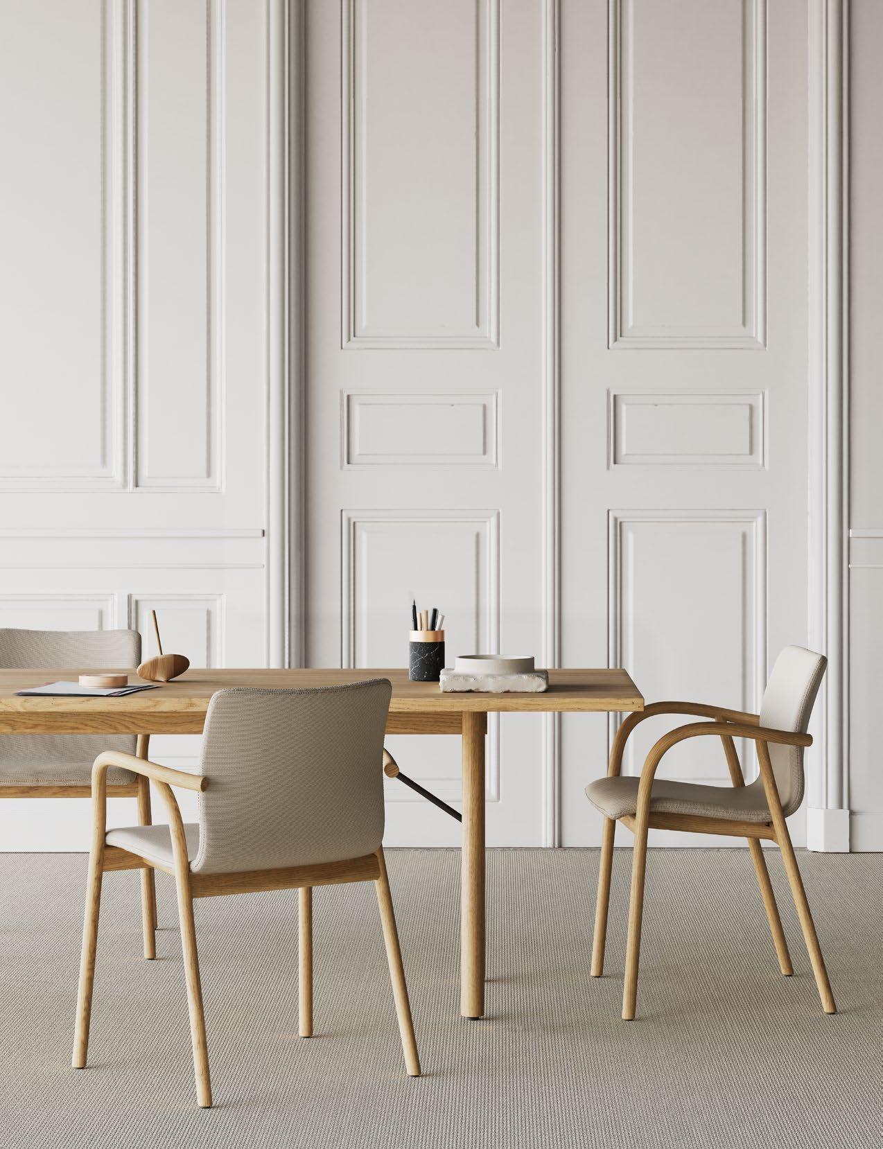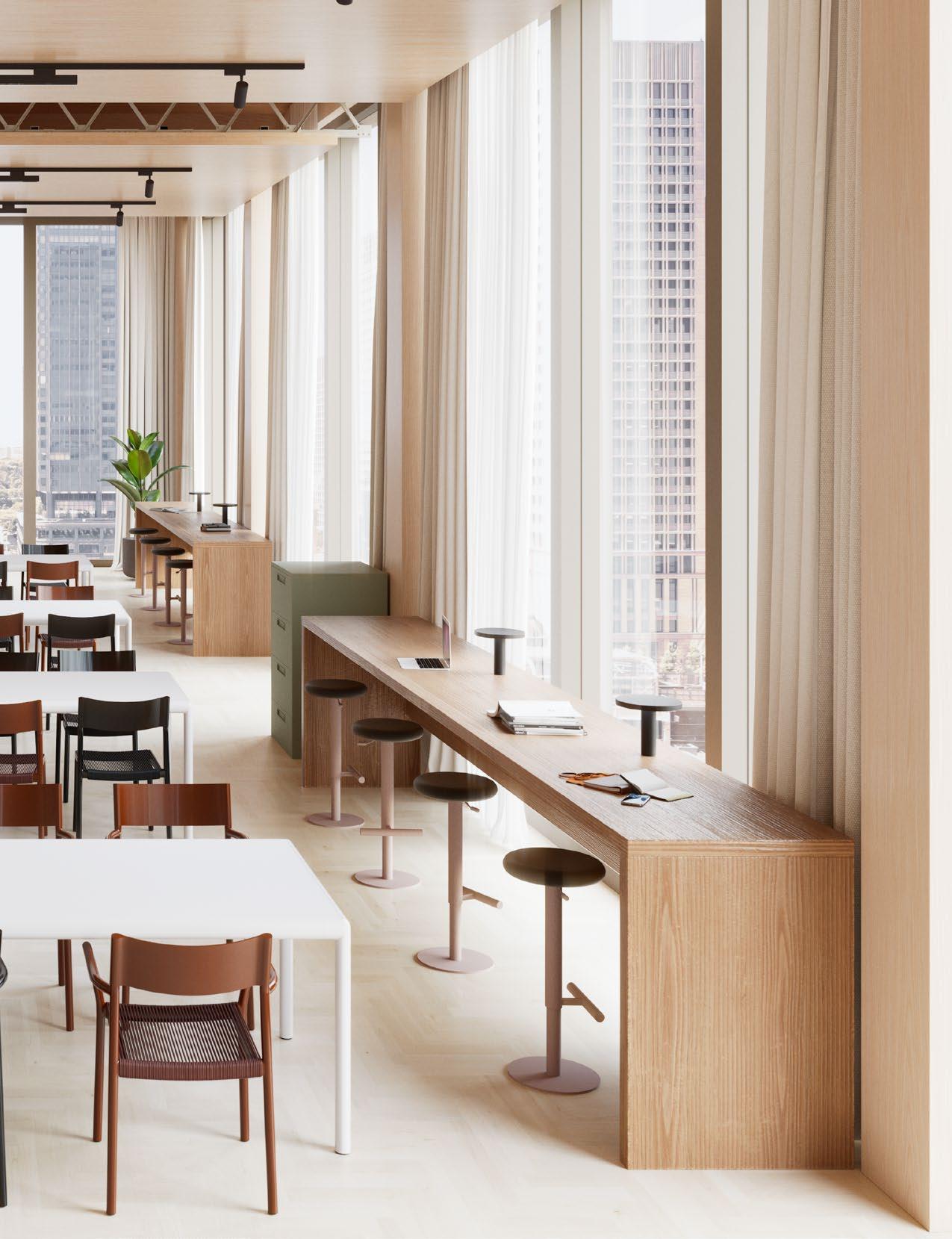 Chairs and desks made of solid wood are not very common in the office environment. The concept of working places integrating home and office made a change, and I think it became more like that. The touch of our hands and bodies with the wood means coexisting with trees and getting closer to nature. It means living together. Wooden round bars do not cast strong line shadows in the space. It is beautiful and warm, in harmony with air, light, and people.