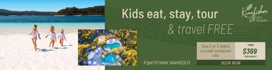 Are you dreaming of a family getaway for the September school holidays? Stay in a self-contained villa for 2 nights or more and SAVE BIG with Kingfisher Bay Resort’s Kids Eat, Stay, Tour and Travel for Free deal – now including free island tours for kids! CLICK FOR MORE >>
