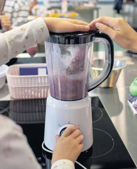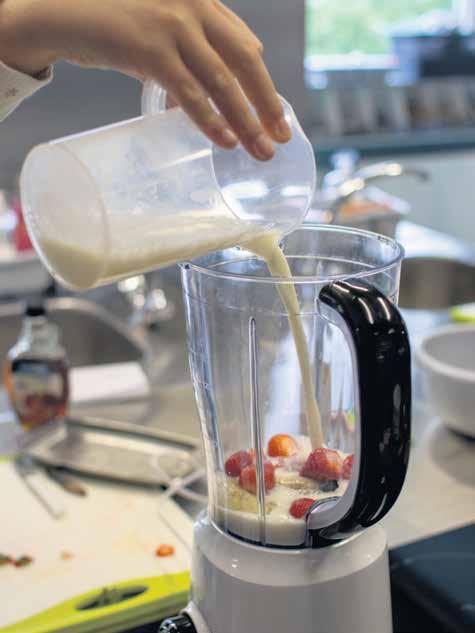 Lilianna en Aurora maken vandaag een smoothie (zie kader). Als hij klaar is, gaan ze met iedereen uit de klas de smoothie drinken. ‘Ik proef verschillende soorten fruit tegelijk in 1 smaak’, zegt Lilianna. ‘Je moet de smoothie goed mixen in de blender, want anders heb je er stukjes in. En als je hem dunner wilt, doe je er meer amandelmelk door’, vertelt Aurora.