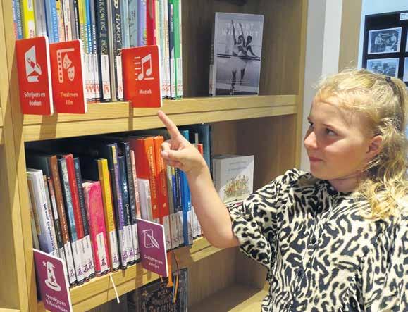 Je kunt aan symbolen zien waar een boek over gaat. Fleur wijst het bordje van een symbool aan in de kast. De symbolen staan ook op de rug van een boek.
