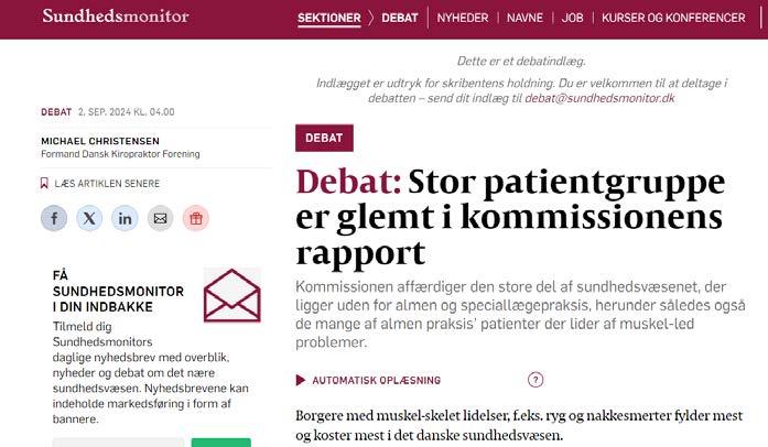 Derudover mindes der om, at muskel-led-problemer er den sygdom der rammer flest og koster mest i det danske samfund. For at imødekomme netop den monumentale udfordring opfordres til at man bringer kiropraktorernes kompetencer i spil som et fremskudt speciale i stil med de praktiserende speciallæger.