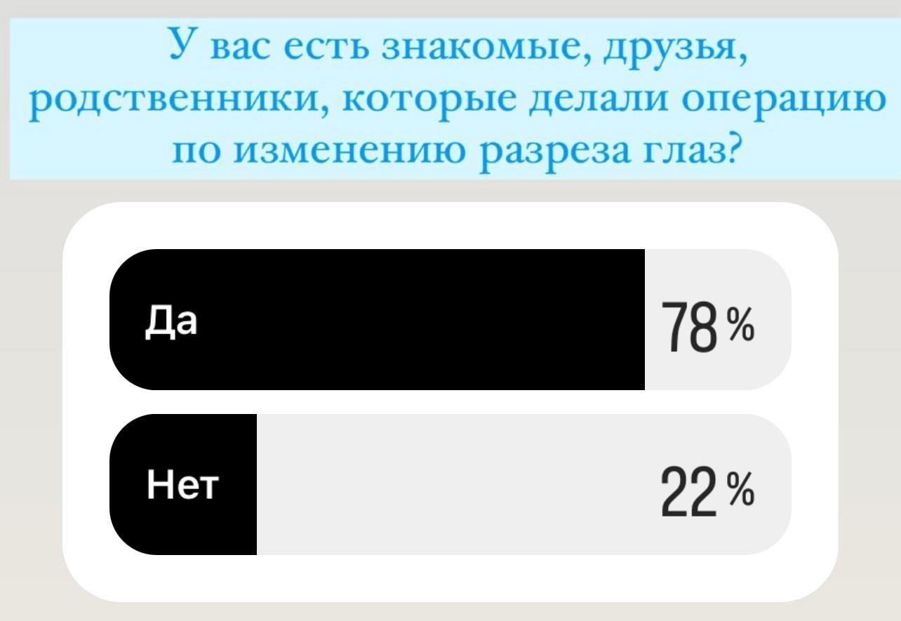 Таким образом, проведя небольшое исследование, я пришла к выводу, что девушки в России в настоящее время не руководствуются политической категорией стандарта красоты. Многолетняя практика этой процедуры показала, что ни одна азиатка не стала европейкой после такой операции. Соответственно, такая операция не защищает ее от расовой дискриминации в стране. По результатам опросов, лидируют мнения о привлекательности и красоте, навязанные общемировыми трендами, социальные сети, навязанные стандарты красоты в детстве (психологические травмы). Также часто встречалось мнение о каких-либо неудобствах (использование косметики, нависшее веко, асимметрия глаз ).