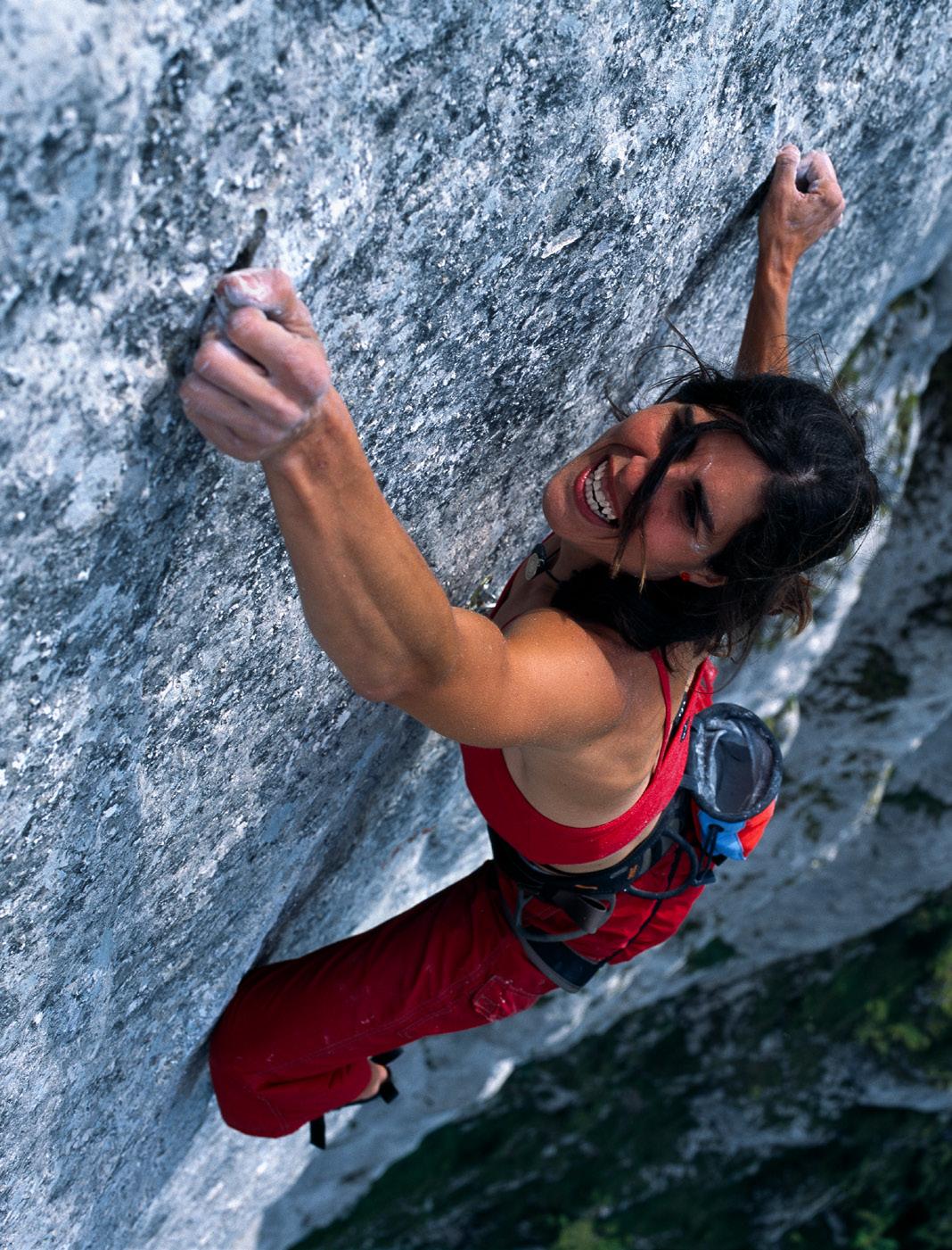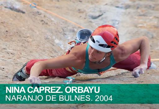 Nina Caprez nació hace 34 años en Suiza. Es otro ejemplo de cómo el mundo de la competición durante la adolescencia forja la personalidad y proyecta todo el entre namiento y la tecnificación hacia activida des más técnicas en el futuro. Encadenan do 8c+, es amante de las vías de largos, de los viajes, las aventuras y la felicidad. Nina es de las que piensa que la vida es dema siado corta para estar triste y que los moto res de nuestra existencia son los objetivos. Es la manera de canalizar nuestra energía, de cumplir nuestros sueños. Su referencia: Lynn Hill. La suiza y la americana formaron cordada en El Capitan para celebrar el 25º aniversario de la liberación de The Nose por Lynn. También tenemos cerca su escalada en el Urriellu, Orbayu, con su compañero y mentor, Cedric Lachat.