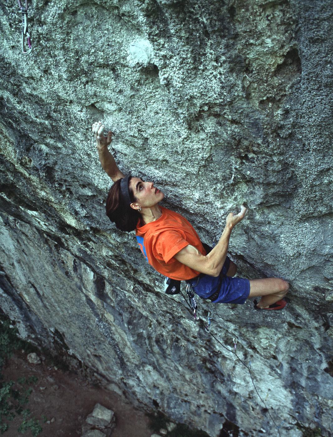 como un escaladora mas dentro de aquel colectivo. La propia iner cia del grupo que componíamos, la evolución que teníamos todos los escaladores, me llevó, por pura na turalidad, a los pocos años de em pezara escalar, a estar intentando una vía de 8c. La realicé más rápido de lo que me hubiese imaginado, pero con un gran esfuerzo que sin dudarlo comportó un gran peaje, comprometiendo mis años de es calada. Todo aquel grupo de es caladores me empujó a intentar lo que aun no se había conseguido por ninguna mujer. Había iguala do el límite escalado por una mu jer (8b+, Linn Hill) y me aupaban a que lograse superar una barrera, la del 8c.