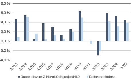 Danske Invest 2 Norsk Obligasjon NI2 var ned 0,05 prosent i september, som likevel var litt bedre enn referanseindeksens utvikling. Likviditetsfondet Danske Invest 2 Norsk Likviditet NI 1 steg 0,37 prosent som var omtrent likt med referanseindeksen. Alle fondstall er oppgitt etter fratrekk av standard forvaltningshonorarer.