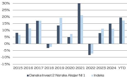 Oslo Børs Hovedindeks (OSEBX) endte ned minus 0,1 prosent i september. Danske Invest 2 Norske Aksjer NI 1 leverte 0,3 prosent, som var 0,4 prosent bedre enn OSEFX. Hittil i år er fondet opp 19,5 prosent (2,1 prosent foran OSEFX). Alle fondstall er etter fratrekk av standard forvaltningshonorar (0,90 prosent årlig).