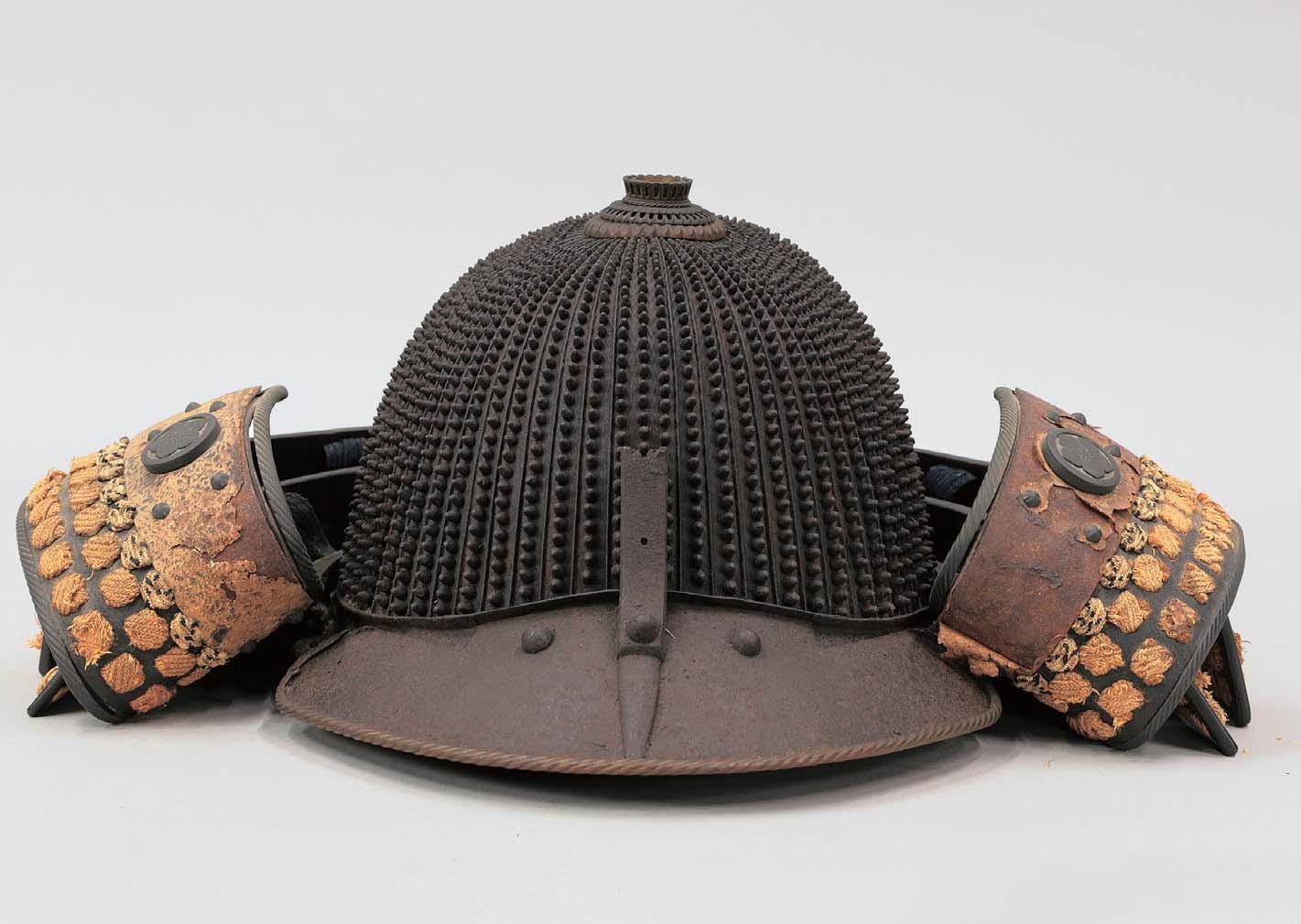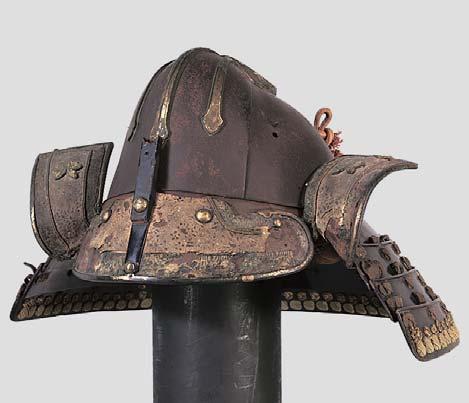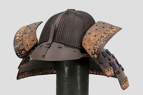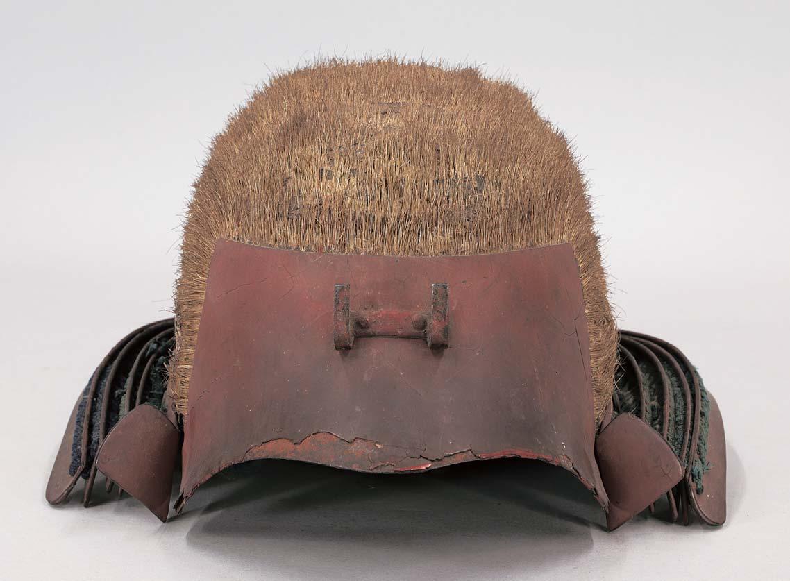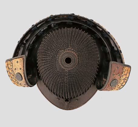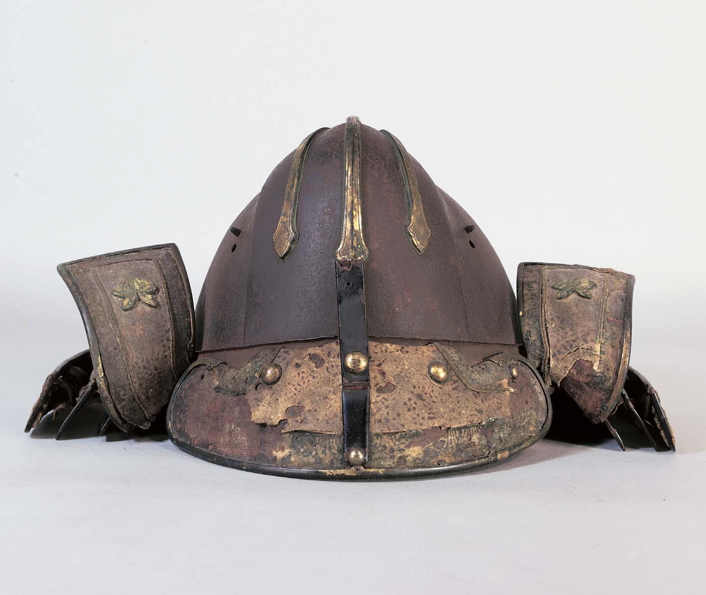 古格を示す鉢金は後代に黒漆の塗直しを行っており、剥離した漆の向こうに往時の黒漆を垣間見る。八幡座は金 工五段、四天鋲と響孔を高く設け、笠印付鐶を更に高い位置に打つ。眉庇は黒漆素文として三光鋲で留める。 は鉄 板札五段を黒漆塗として萌葱絲で素懸に威すが、後代の寄せも想定せねばなるまい。吹返は素文一段、外郭五点を 穿孔した六曜とする。眉庇を含め鉢金の裏は朱漆塗としている。