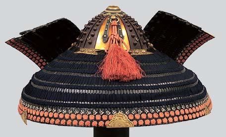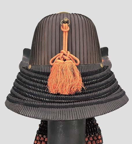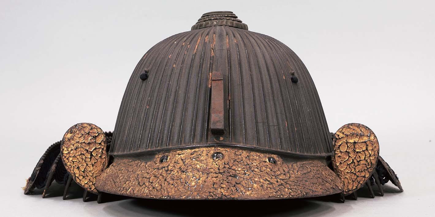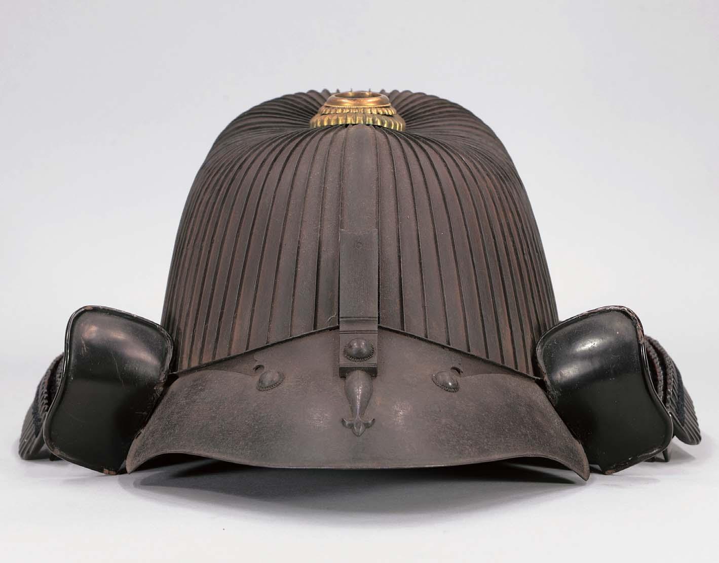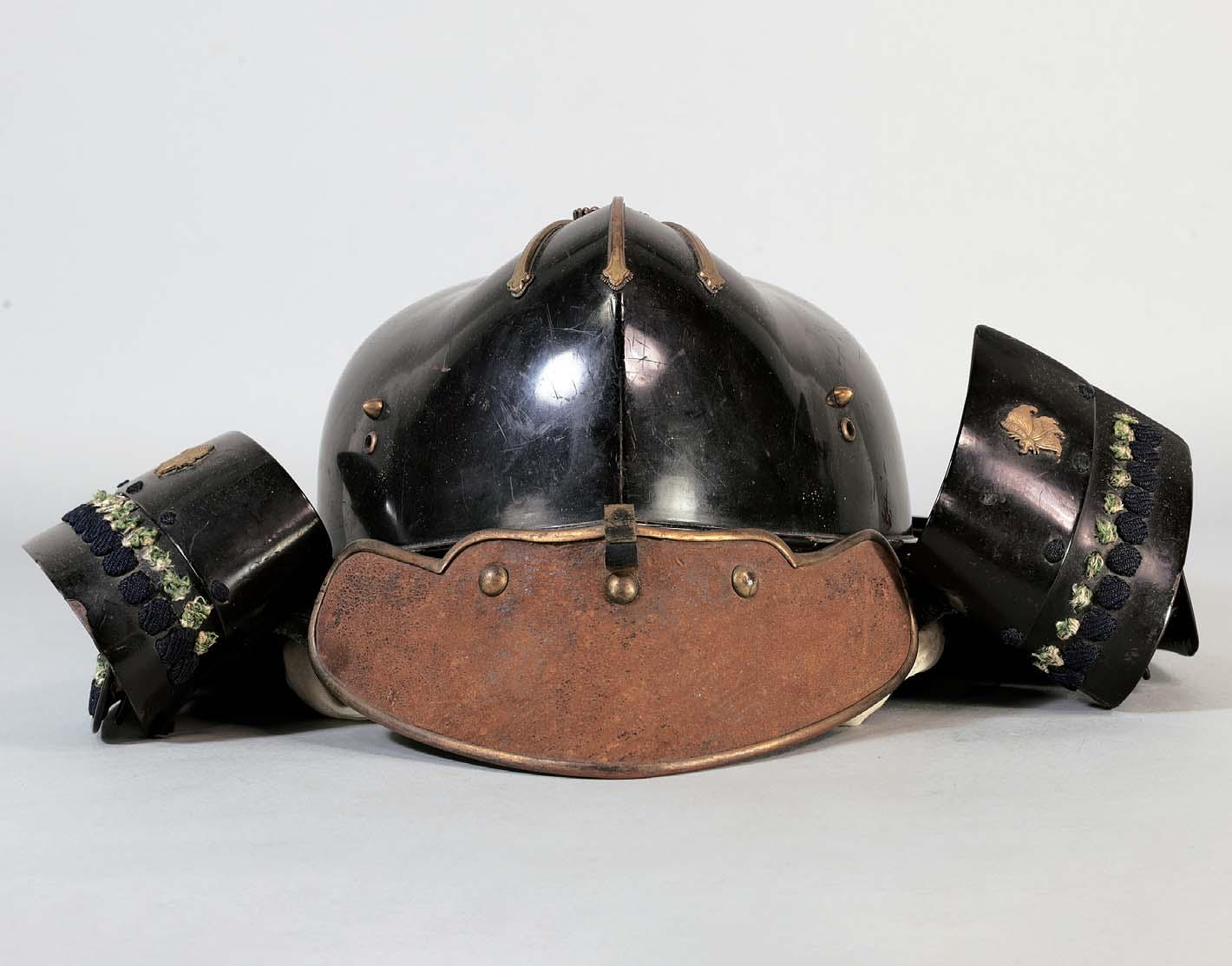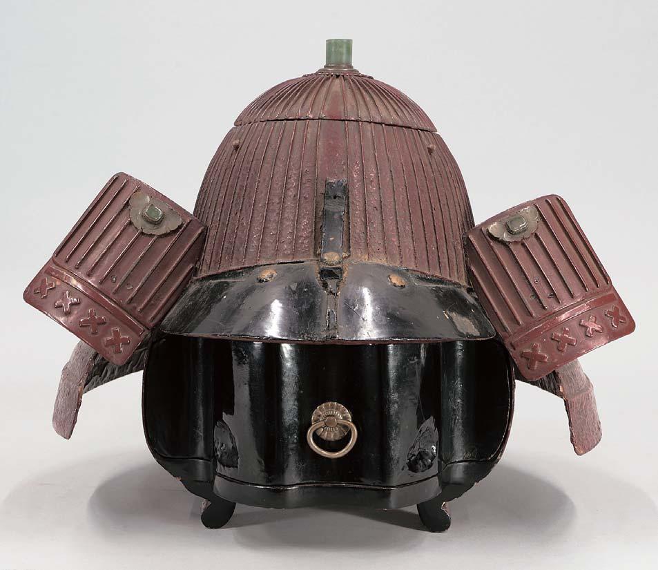 古格を示す鉢金は後代に黒漆の塗直しを行っており、剥離した漆の向こうに往時の黒漆を垣間見る。八幡座は金 工五段、四天鋲と響孔を高く設け、笠印付鐶を更に高い位置に打つ。眉庇は黒漆素文として三光鋲で留める。 は鉄 板札五段を黒漆塗として萌葱絲で素懸に威すが、後代の寄せも想定せねばなるまい。吹返は素文一段、外郭五点を 穿孔した六曜とする。眉庇を含め鉢金の裏は朱漆塗としている。