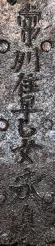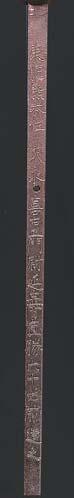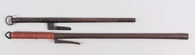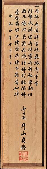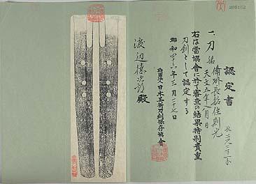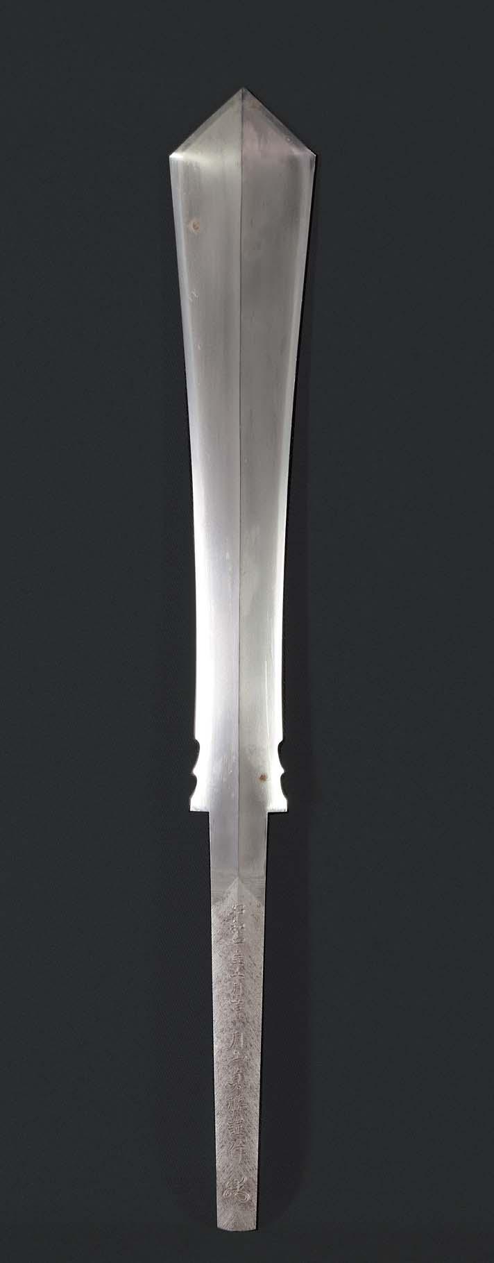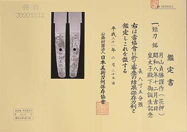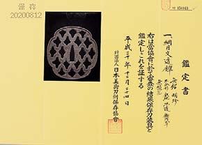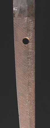 93 C-173 松村昌直 刀 付拵 ¥650000~ 付錦刀袋 長さ713 反り16 目くぎ穴1 差表刃中小鍛キズ 差裏横手下刃中小キズ 切先小キズ 鎺元棟小キズ 表銘(差裏):松村昌直 裏銘(差表):寛政九年(1797)二月 岡山県第88029号 C-174 無銘「文珠重国」 刀 付拵 白鞘 ¥600,000~ 付錦刀袋 紫刀袋 保存刀剣鑑定書(日刀保) 本阿弥光遜鑑定小札 長さ二尺六寸六分 反り五分 目くぎ穴一 差表刃境鍛キズ、平地鍛キズ 鎬地小鍛キズ 鎺元小刃コボレ 棟小サビ 鞘ワレ、剥離 本間薫山鞘識(昭和壬戌・1982) 熊本県第3571号