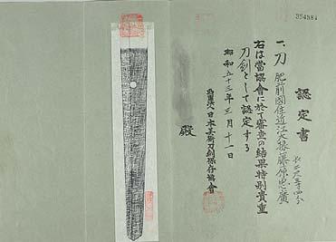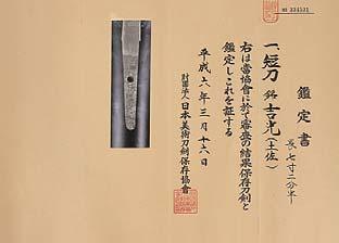 85 C-162 肥後大掾下坂 脇差 付拵 白鞘 ¥980000~ 付錦刀袋 紫刀袋 特別保存刀剣鑑定書(日刀保) 長さ394 反り06 目くぎ穴2 切先先端極小サビ 表銘:肥後大掾下坂 石川県第21821号