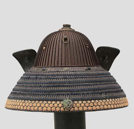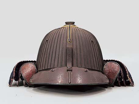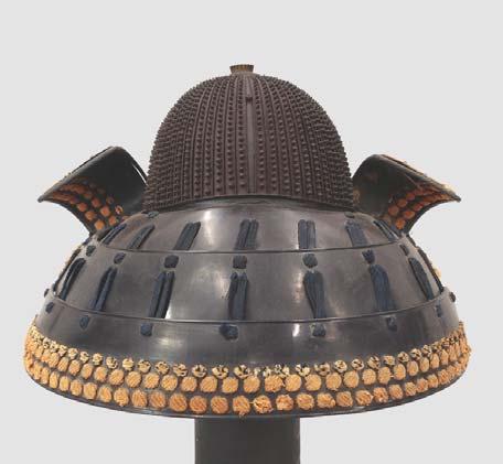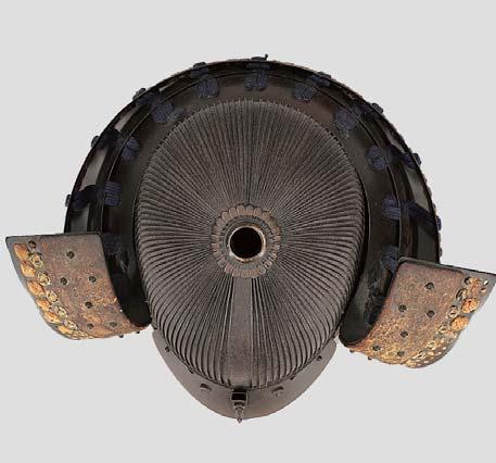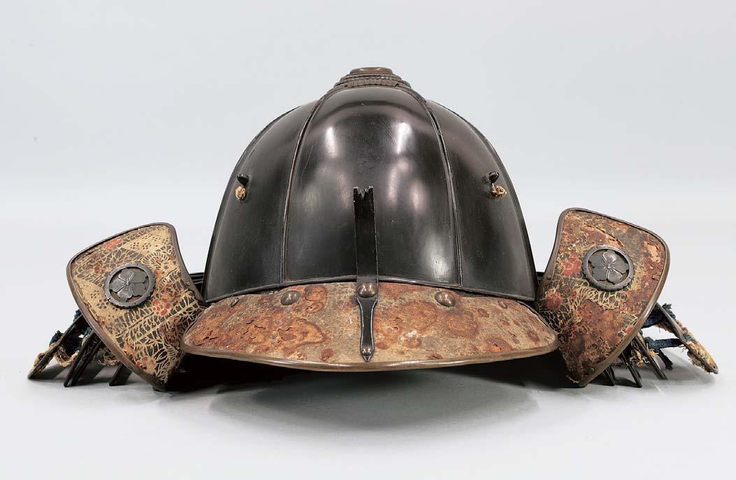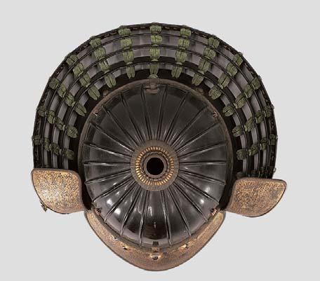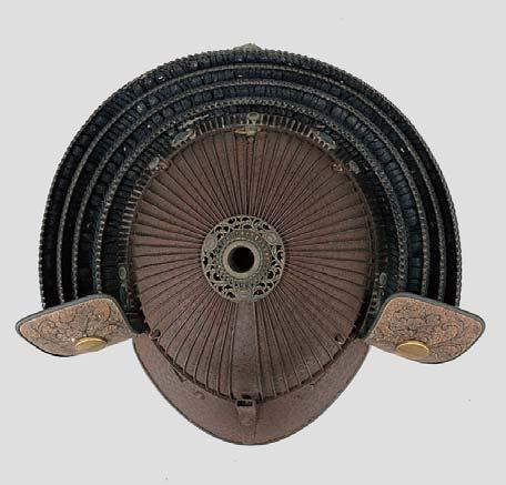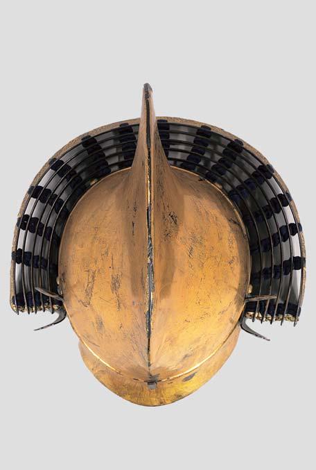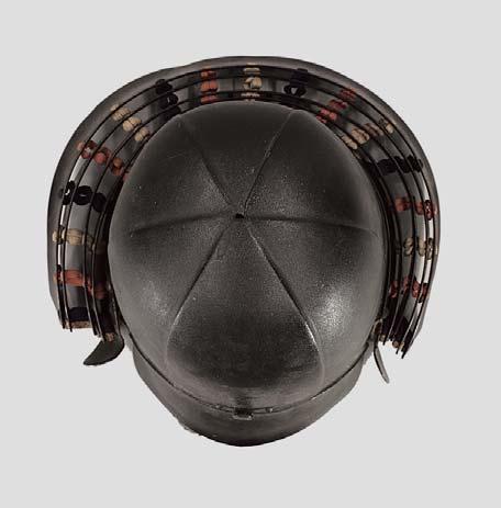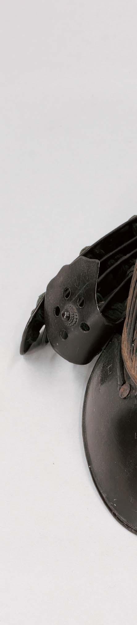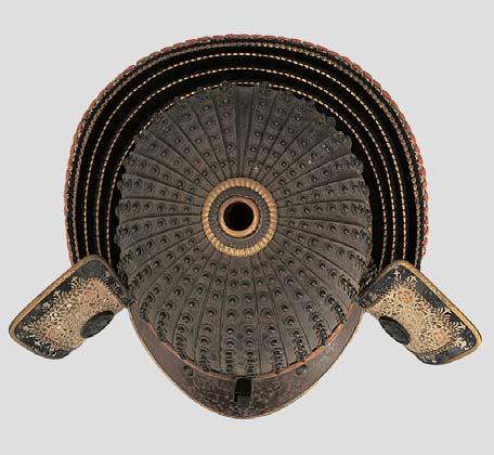 44 C-057 鉄黒漆塗額当形兜 ¥1000000~ C-055に類似する姿形ながら、鉄板六枚張で鉢高を低く取り、前正中鎬の他は緩急ある曲面で構成される。天辺は金銅魚子地唐草毛彫の丸座を底に、裏 菊、表菊、小刻、抱花に玉縁を重ねた八幡座を戴く。前正中には小刻座金の篠垂を三条、中腹ほどまで垂らす。四天鋲、響孔を設け、裏菊座金の笠印付鐶 を打つ。 は鉄板札を黒漆塗として四段を紺絲で素懸に威す。肩摺板の菱縫も同絲で一段とし、白緑の啄木絲で畦目を飾る。吹返は二段、黒漆塗素文と して金銅蝶の据金物を打つ。眉庇は韋貼の金銅覆輪で一本角本を立てるが、後補も想定せねばなるまい。なお後正中に打傷を認める。