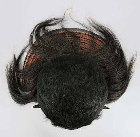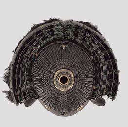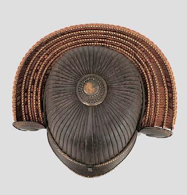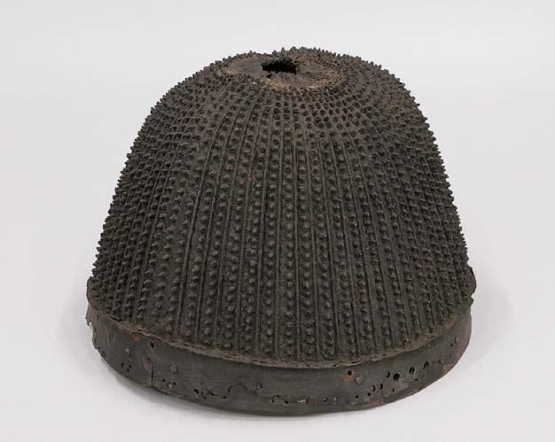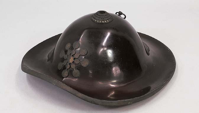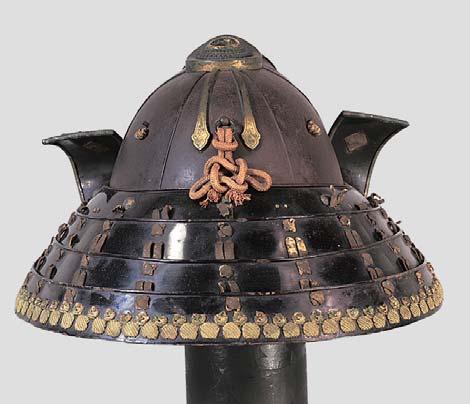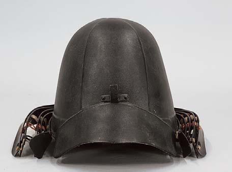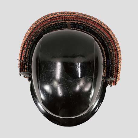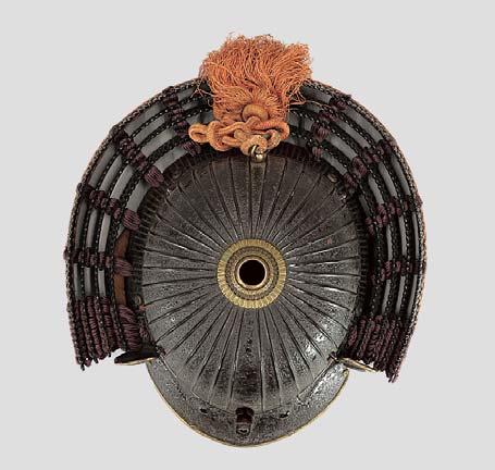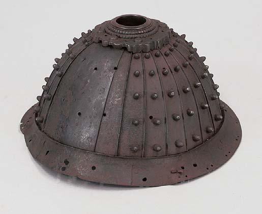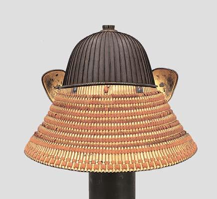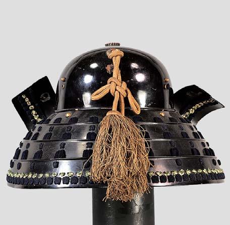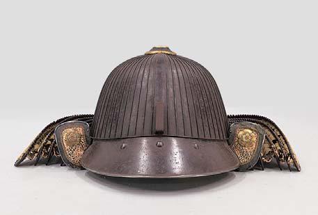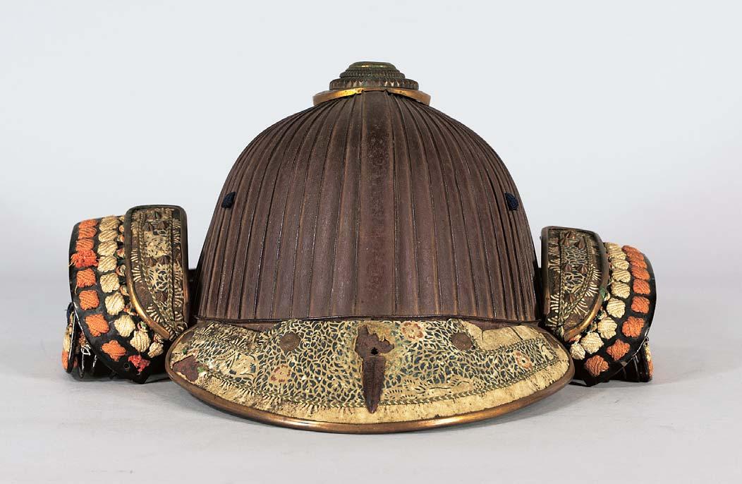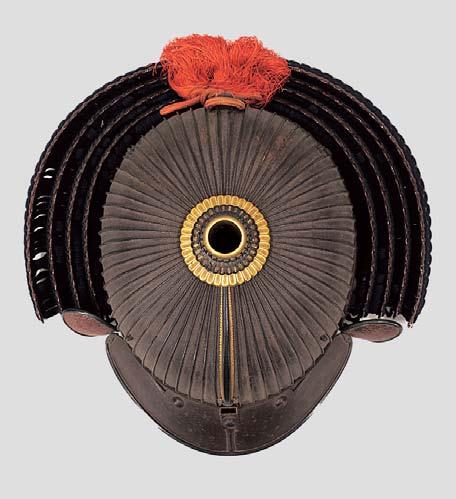 44 C-057 鉄黒漆塗額当形兜 ¥1000000~ C-055に類似する姿形ながら、鉄板六枚張で鉢高を低く取り、前正中鎬の他は緩急ある曲面で構成される。天辺は金銅魚子地唐草毛彫の丸座を底に、裏 菊、表菊、小刻、抱花に玉縁を重ねた八幡座を戴く。前正中には小刻座金の篠垂を三条、中腹ほどまで垂らす。四天鋲、響孔を設け、裏菊座金の笠印付鐶 を打つ。 は鉄板札を黒漆塗として四段を紺絲で素懸に威す。肩摺板の菱縫も同絲で一段とし、白緑の啄木絲で畦目を飾る。吹返は二段、黒漆塗素文と して金銅蝶の据金物を打つ。眉庇は韋貼の金銅覆輪で一本角本を立てるが、後補も想定せねばなるまい。なお後正中に打傷を認める。