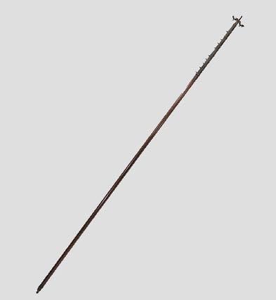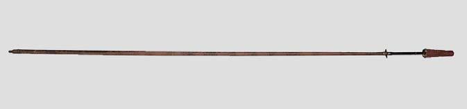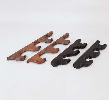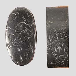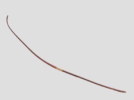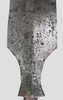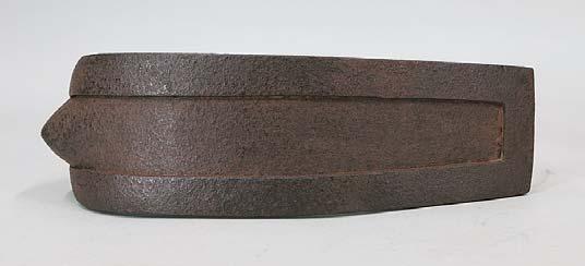 72 C-138 舌長鐙 一双 ¥750,000~ 付木箱(杉 貼札) 舌先幅80cm 舌最大幅98cm 総長335cm(鳩胸先から舌先まで、静置時) 高さ285cm(接 地面から鉸具頭まで、静置時) 総体は錆地で覆われており、紋板は緩やかな外反曲線を描いて立ち上り、木瓜形の紋金物を 鋲留して紋透を四とし、母衣付孔を穿つ。舌は伸びやかに鍛造される。鳩胸は強く張出して下 方は切れ込んでいる。踏込から鳩胸にかけては別作しており、裏から鋲留する。 仕切板のついた杉箱に一双とも収まる。