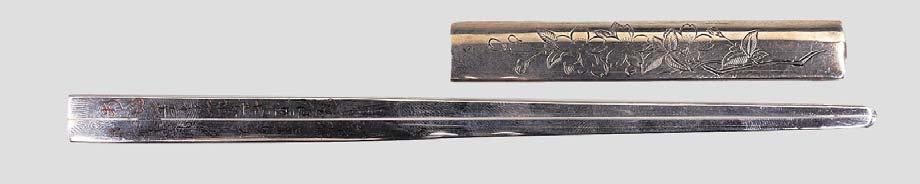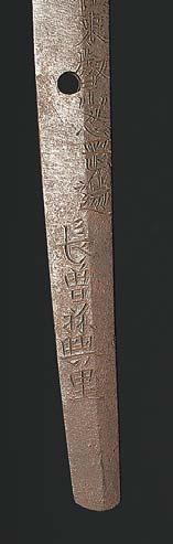 90 C-170 長曽祢興里 刀 付白鞘 ¥1000000~ 付紫刀袋 長さ686 反り14 目くぎ穴1 差裏小鍛キズ、物打小鞘アタリ 棟小サビ 刃区極小カケ 差裏小キズ 差裏鎺元刃中小サビ 極小刃コボレ 表銘:住東叡山忍 邊長曽祢興里 千葉県第050324号 長曽祢興里(生歿年未詳)。江戸前期の刀工。虎徹は刀工時代の別名の一つ。