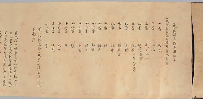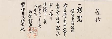 67 C-128 雲龍描絵 陣羽織 ¥300000~ 54×102 太刀受付 C-129 秋草象嵌鉄扇 ¥100,000~ 付木箱(桐) 総長32 C-130 韋雲龍軍配 ¥90,000~ 付木箱(桐 貼札・シミ) 総長55 C-131 采配 ¥30,000~ 柄32 C-132 火消装束 一口 ¥50,000~ 28×55ほか 胸当10 腰帯3