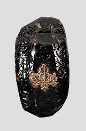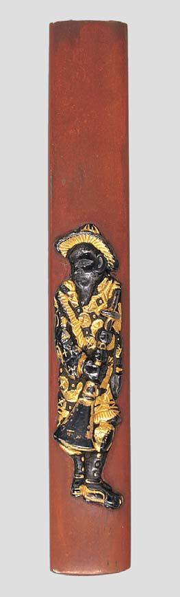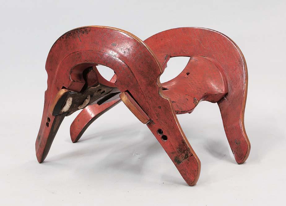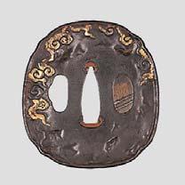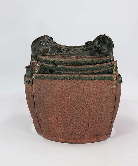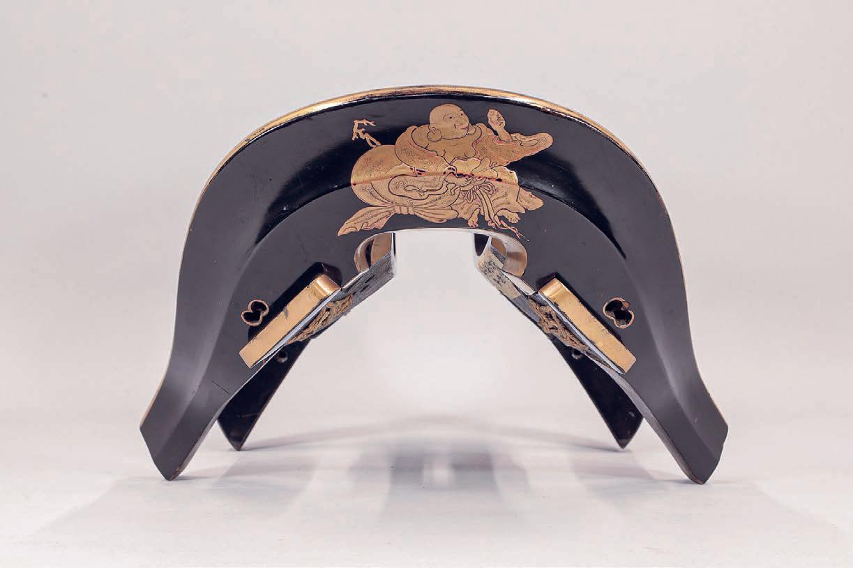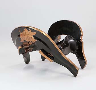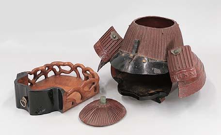 64 C-107 鉄黒漆塗目下頬 ¥120,000~ C-108 鉄黒漆塗半頬 ¥100,000~ 裏朱(漆剥離、ウキ) C-109 家紋鳳凰蒔絵陣笠 ¥120,000~ 29×31×10 アタリ 丸に剣片喰紋 C-110 鳩蒔絵トンキョ帽 ¥100,000~ 33×35×21 剥離 裏銘:寅三月精 上々革張布着鹿児城明珍 C-111 朱塗桶側二枚胴 ¥50,000~ 付櫃 C-112 背割胴 ¥50,000~ イタミ 片喰紋 C-113 童腹当 ¥50,000~