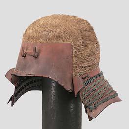 43 C-055 鉄錆地額当形兜 ¥1200000~ 錆地の鉄板六枚を矧ぎ合わせ、前正中の膨らみを強くして眉庇にかけて直線的に形成される。天辺には鉢の形状に合わせた金工五段の八幡座(銅鍍金魚 子地菊毛彫丸座、裏菊、表菊、小刻、玉縁)を戴く。前正中三条、後二条の篠垂は小刻座金を置いた銅鍍金製。四天鋲と響孔を設け、笠印付鐶は鍍金素文丸 座を置いて低めに打つ。眉庇は絵韋貼で小縁を蛇腹伏として鍍金三光鋲で留め、鍍金の覆輪を廻らす。経年により文様は不鮮明。裏は朱塗。先端をW字に 刻んだ一本角本は黒漆を塗る。 は鉄板札を黒漆塗として四段を韋で素懸に威す。肩摺板は啄木打畦目に萌葱絲菱縫一段を飾る。吹返は一段、眉庇と同工 として銅鍍金の「雪持ち五枚葉紋」の据金物を打つ。