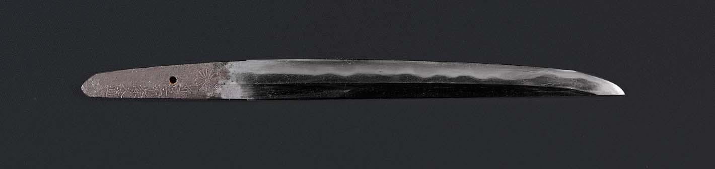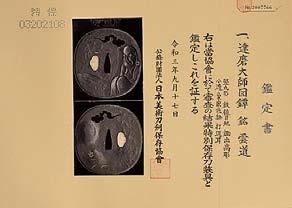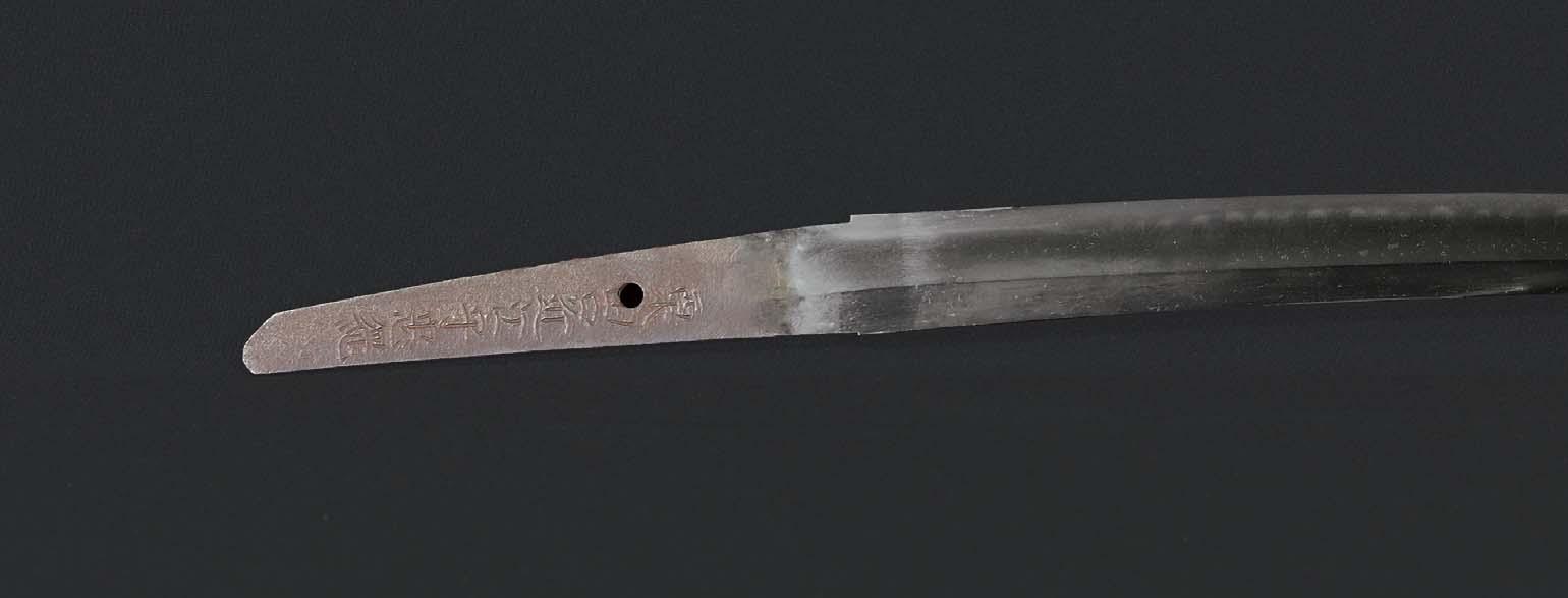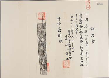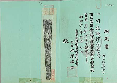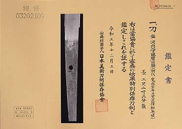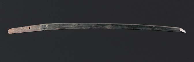 97 C-180 陸奥守包保(左字) 刀 付雲文変塗拵 白鞘 ¥570,000~ 付錦刀袋 紫刀袋 特別貴重刀剣認定書(日刀保) 長さ776 反り11 目くぎ穴1 差裏鎺元鍛キズ 差裏鎬筋鍛キズ 栗形鵐目一欠 表銘:陸奥守包保(左字) 東京都第6912号