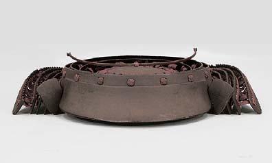 55 C-073 鉄錆色漆塗 六十二間筋兜 ¥450,000 付木箱(桐) 肩摺板大破 「藤原 金久作」在銘 C-072 鉄黒漆塗十二枚張突 兜 ¥480000~ 付時代合箱(杉) 漆大破 補彩 木胎銀箔押繰半月前立 (接合補修)
