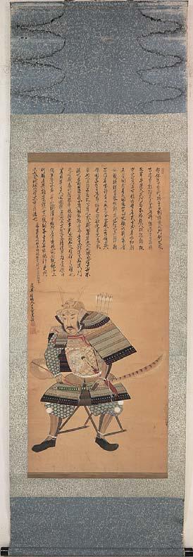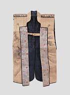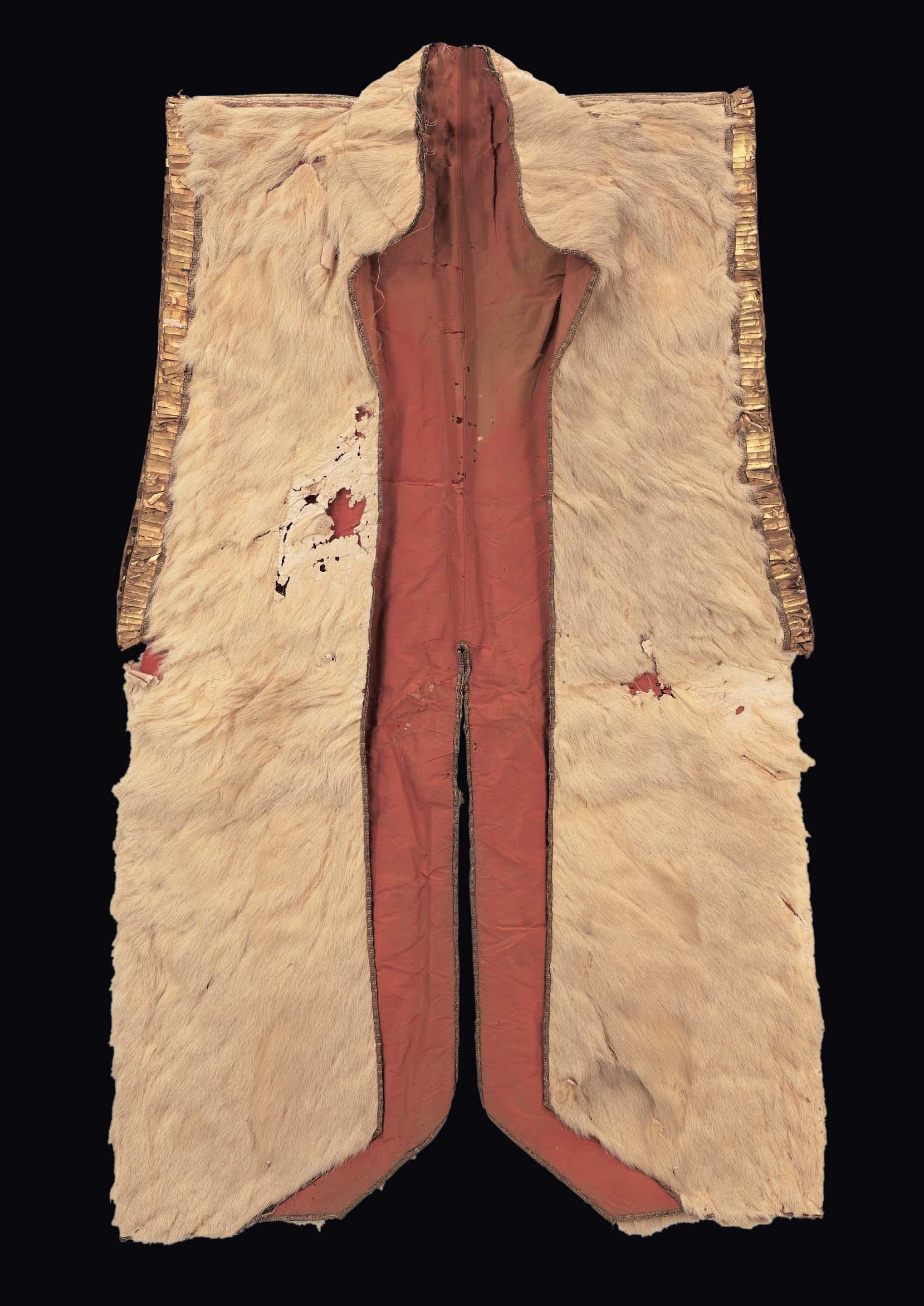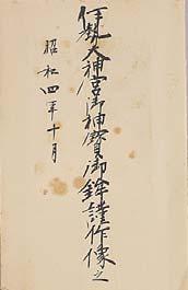68 C-134 白毛韋陣羽織 ¥1000000~ 付二重箱(内時代貼札識杉 破損) 48×103 獣未詳の白毛皮を裁断して縫合し、裏に紅平絹を充て、襟も同毛皮として縁に金モールを廻す。肩は太刀受で飾り、袖口には南蛮襟 風の襞飾に見紛う金箔押の切紙を厚く重ねて付す。毛皮の損傷が惜しまれるものの、付帯する伝承を是とすれば、桃山期における豊臣 秀吉につらなる新出の染織品として注目されよう。 掲出には、森寺忠勝が秀吉から拝領したとする伝承の諸記録が付帯している。二重の杉箱が伴い、「陣羽織 秀吉公より拝領」の墨 書をもつ畳紙に陣羽織を納め、内箱蓋甲に「従太閤秀吉 森寺忠勝江拝領之陣羽織」と墨書し、「池田博愛由緒品、秀吉拝領陣羽織」 と朱字した紙片と、「陣羽織一 右明治三十一年(1898)四月於京都豊公三百年之節同博物館○○同六月六日返却相成事」と墨書した 紙片を貼付される。破損した外箱の蓋には「岐阜県海津郡今尾町 池田博知殿」の墨書をみる。 森寺忠勝は16世紀の武将で、先祖は伊勢赤堀城主であったが武運拙く落城し、忠勝の父秀勝の時世に美濃の織田信秀を頼り、織田家 重臣の池田恒興に仕える。姉川合戦においては秀勝と共に前髪で恒興の麾下として出陣し武勲を挙げた。以後、幾多の戦場で武功を挙 げる中、特に山崎合戦で無類の奮闘があったという。秀吉から陣羽織拝領という栄誉も首肯できる人物であったと想像できる。なお忠 勝には嫡子がなく、池田家から養子を迎えたが夭折。その弟の池田長政が森寺家四代目の家督を継ぎ、のち、家名を池田に改めた。先 述の池田博愛は当家十四代当主で、博知はその次男。 掲出が荒れて伝来した理由について、徳川三百年の幕府による豊臣家封印の歴史が関係していよう。ちなみに、徹底的に破却された 豊国神社の再建は、豊臣・徳川両家の霊的な和解が求められた明治十三年(1880)を待たねばならなかった。