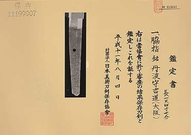 95 C-176 丹後守兼道 脇差 付拵 白鞘 ¥650,000~ 付錦刀袋 紫刀袋 特別貴重刀剣認定書(日刀保) 長さ540 反り17 目くぎ穴1 差表物打刃中小鍛キズ 表銘:丹後守兼道 東京都第28397号