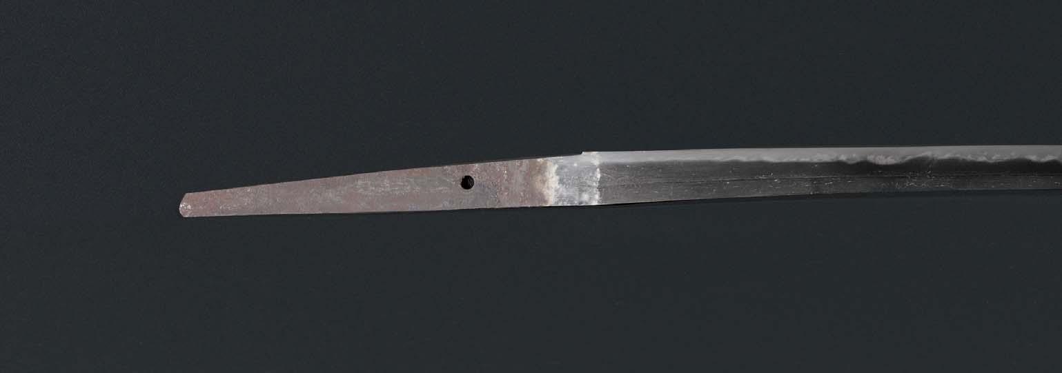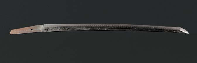 91 C-171 長舩祐定 太刀 付太刀拵 白鞘 ¥650000~ 付柿色錦刀袋 紫刀袋 長さ663 反り22 目くぎ穴2 差表切先小鍛元キズ 差裏炭ゴモリ 棟受けキズ 柄小ガタツキ 合わせ繋ぎ 表銘:備州長舩祐定 裏銘:永正二年(1505)二月日 神奈川県第76776号