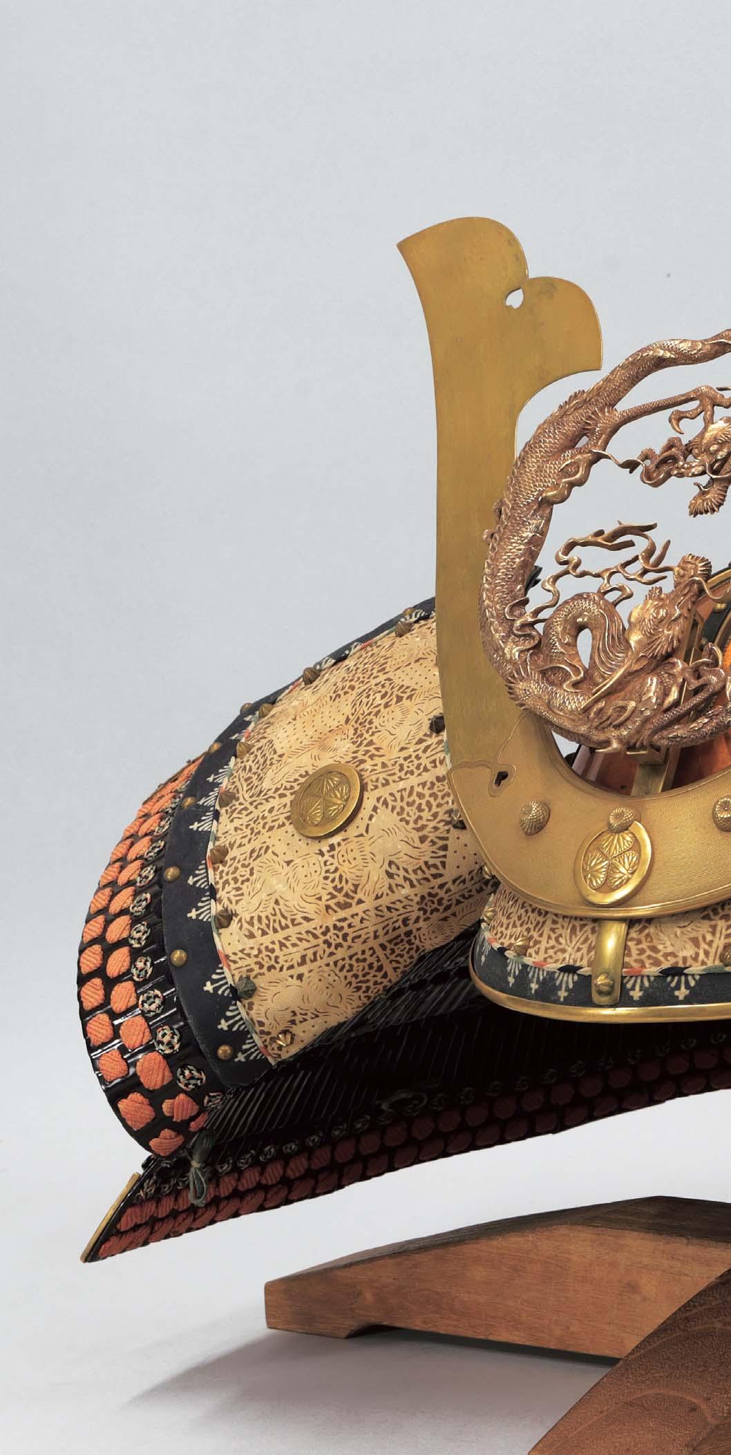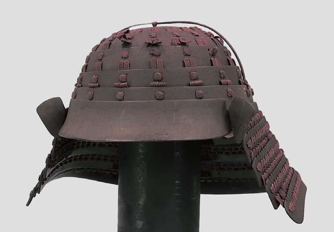 2 C-001 向鉢巻総髪兜付緋絲威二枚胴具足 ¥6000000~ 一作具足としての魅力は勿論のこと、異彩を放 つ兜の表情に注目したい。総髪の鉢金側部に細く 畳んだ手拭を具象した飾りを廻らせ、角を立てる 「こま結び」の目を前立として着脱し、「向こう鉢 巻」としての装飾を通作する。鉢巻とは元来、戦や 祭事など非日常に対する精神一到を決意するも のであるので、本作は奇抜性だけに留まらず、武 士としての心意気も内包した一領となっていよ う。 ※巻末に詳細あり