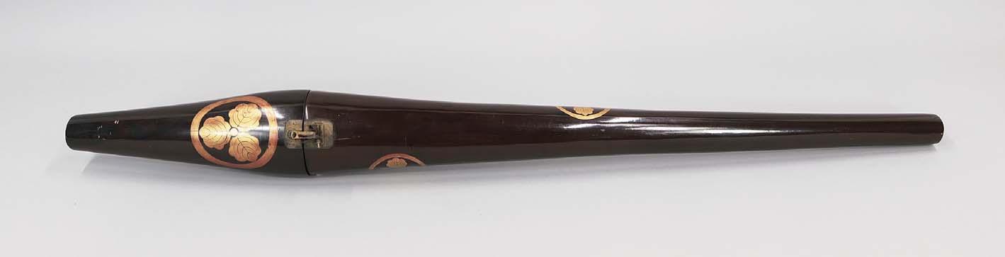82 C-159 黒漆青貝家紋蒔絵大小拵 ¥1000000~ 付錦刀袋二 大総長975 小総長745 小アタリ 小柄欠 柄巻黒糸キレ 水牛角鐺、栗形虫喰 鐔:後藤伝乗(花押)銘 縁:江州利英(花押)銘 久世大和守