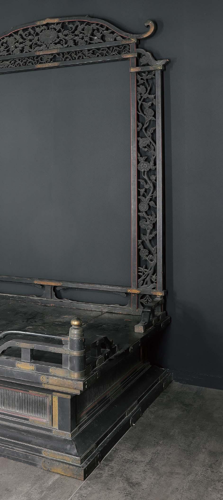 15 #007 黒漆塗須弥壇 ¥2,000,000~  164×136×230 スレ カケ 剥離 須弥壇は佛教世界の中心に聳え立つ須弥山を意識した 壇で、佛像を安置し、供物をそなえ、礼拝する。掲出は、 木造の須弥壇で、上下に框を組み、束を立て連子の羽目 板を入れ、壇上には宝珠と蕨手付の髙欄を廻らし、背部 には衝立状の背板を立て、外周には古風な蓮華唐草を透 かし、欄間部の唐草地には孔雀三羽を三方に散らす。背 板の空隙には羽目板もしくは障子が用意されていた痕跡