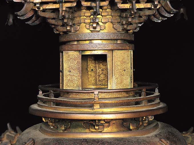 が残る。なお、掲出の作期では、様式的に酷似し、鎌倉時 代に比定される奈良霊泉寺三重塔の須弥壇が参考になろ う。 総体を布下地に黒漆で厚塗し、面取部には朱漆を挿し て変化をみせる。黒漆表面は経年変化を証す断紋が覆う。 要所に充てる鍍金金物には蓮華唐草が毛彫され四隅には 猪目を透かして古風を伝える。