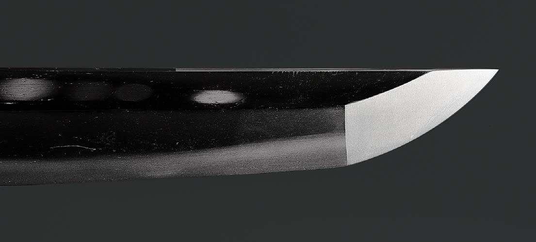 42 #021 鉄黒漆塗二十六間筋兜付仙台胴具足 ¥3,500,000~ 兜 鉄板札二十四枚を矧重ね、筋を立て黒漆塗とする。姿形は緩やかな阿古陀形。後正中に「明珍俊之」と鐫る。天辺には唐草毛彫丸座を 底として六段を重ねた八幡座を置き、小刻座金を添えた篠垂(丸座と同工)を左右各一条、後二条垂らす。前正中の篠垂は入八双を 並列に置いたような形状を採る。鋲飾として四天鋲と響孔を稍低く穿ち、笠印付鐶は座金を高く取って篠垂を躱し、鋲頭を切子とす る。当世眉庇は黒漆塗素文に素文覆輪、W字刻の祓立台を置いて三光鋲で留める。なお表の黒漆は剥離が進行しており、裏は朱漆を 塗改めている。前立は「金地紙に月輪」を金工で象る。 は黒漆板札六段を素懸に威し、畦目と菱縫まで紺絲で統一する。吹返は一段、 眉庇と同工とし、鍍金の「下がり散藤紋」の据金物を打つ。 面具 鉄錆色漆塗目下頬。頬皺を打出し、耳の六曜を透かし汗抜孔を穿つ。耳部は漆剥離。垂は鉄板札四段。 胴 黒漆塗鉄板で構成された仙台胴で、洗練された姿形をみせる。各板裏に茶皺韋を貼り、八間五段威下げの鉄板草摺にまで通底される。 肩上は押付から蝶番で繋ぎ、先端の杏葉も蝶番繋とする。襟廻しは亀甲金を紺羅紗包とし、頸部のみ押付から蝶番での着脱式とする。 鞐は素銅。両乳鐶は笠印付鐶に通底。木胎漆塗板合当理と受筒と枕を具える。連尺胴としての孔も穿つ。 袖 鉄板札六段の当世袖は内に大きく撓む。 三具 紺地錦の家地ほか仕立を共通する。小篠佩楯は踏込式、錆地三本筒臑当は大立挙を鋲で張留める。鉄黒漆瓢籠手は手甲に金銅魚子地