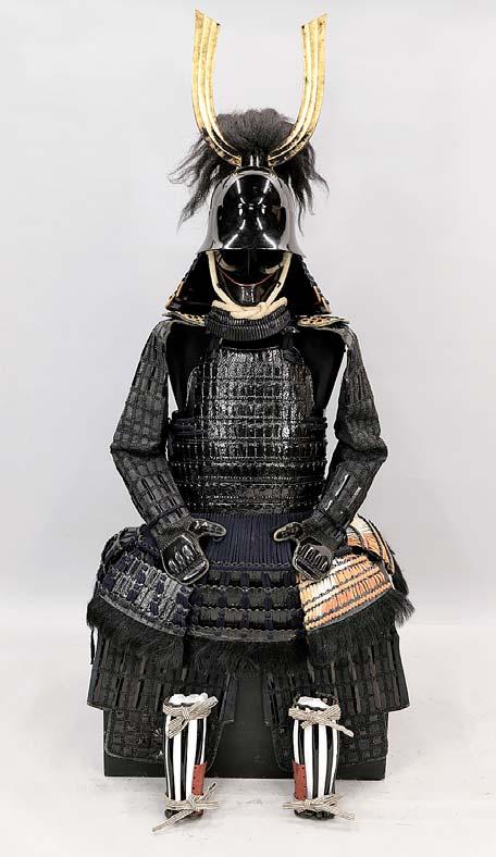 44 #022 越中具足 ¥2,500,000~  兜 鉄板五枚張の頭形兜は眉庇まで黒漆塗素文とし、天辺に角本を立て、熊毛植の頭立を挿す。 は黒皺韋包の鉄板札五段を毛引に威し、 下二段を韋覆輪する。吹返はない。 面具 鉄半頬。表を黒漆、裏を朱漆塗。汗抜孔を穿つ。垂は切付札四段。 胴 練韋板札を黒皺韋包とした桶側二枚胴。前立挙三段、後四、長側五段構成。三板のみ鉄板を採用する。肩上も練韋製、襟廻しは亀甲金 を包む。鐶類を付さず、合当理もない。草摺は碁石頭の七間四段威下げ。紺絲威を軸とし、左側のみ紅白絲で威す。裾板に熊毛を植  える。 三具 家地ほか仕立を共通しており、何れも越中様式を踏襲する。臑当は九本篠。覆輪は肩摺板と仕立を異にする。 附属 黒羅紗陣羽織、木胎黒漆塗陣笠、網代胎一荷櫃に添う韋覆には「丸に鞠挟紋」が据えられる。