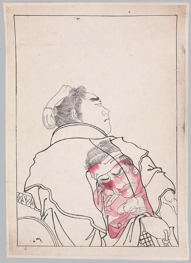 面具 鉄錆色漆塗烈勢頬。髭を上向きに銀描し、下髭は毛植する。折釘に代わり菊座金の金銅鐶を打つ。汗抜孔は洲浜形とし、六曜透の耳