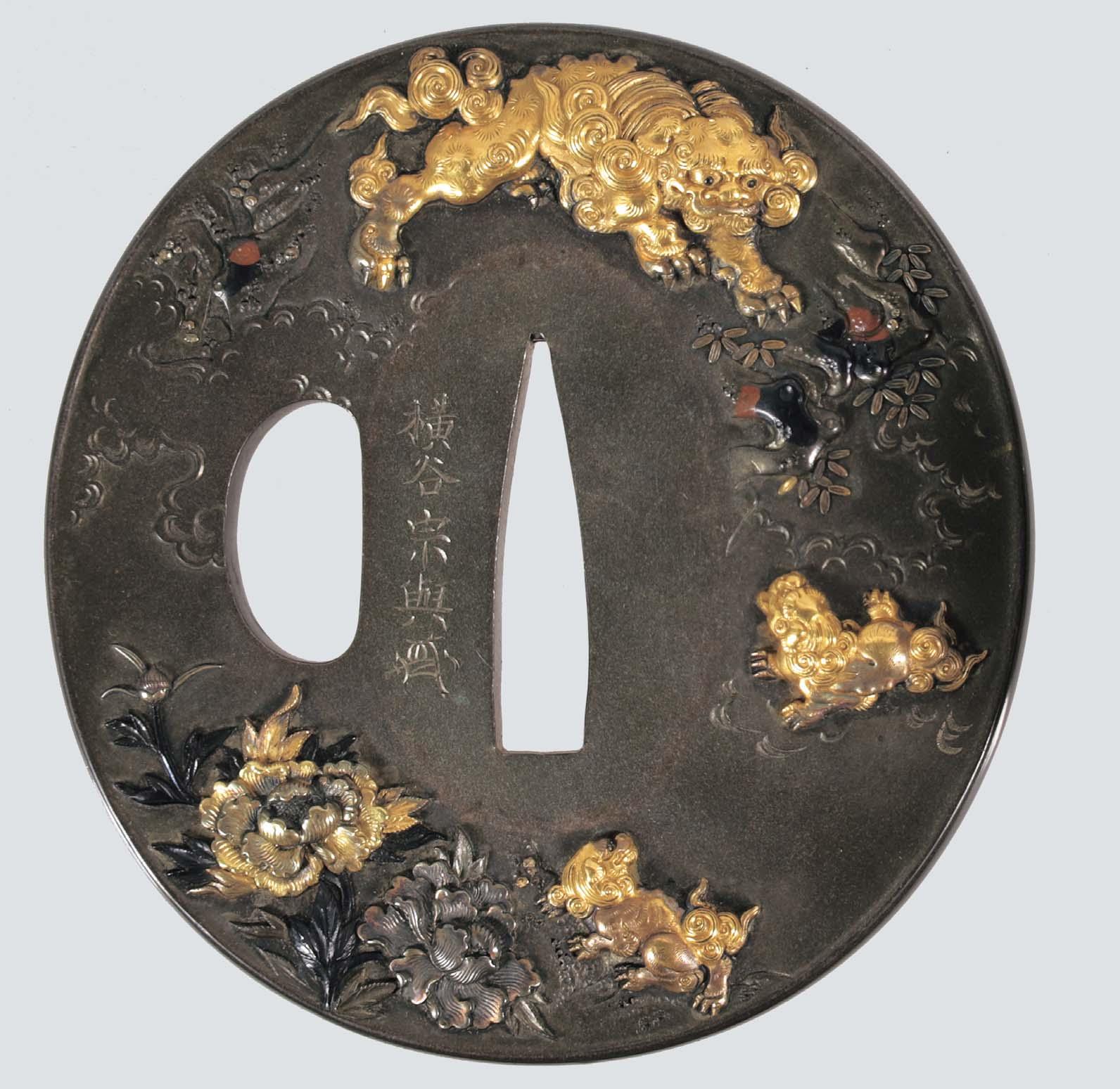 58 #029 四分一地唐獅子牡丹文鐔 縁頭 ¥1,200,000~ 付木箱(桐) 鐔76×79×05ほか 鐔・縁銘:横谷宗與(花押) 横谷宗與は二代に亘る刀装金工師として知られる。掲出は二代目の作。 二代宗與(元禄十三・1700~安永八・1779)は江戸生。初代宗與門下であった横谷宗寿の次男。宗珉の養子となり、享保十八年(1733)に家督 を継いでいる。四分一磨地に片切彫の作品を遺す。また「横谷宗與(花押)」と鐫銘する。 なお初代(次兵衛。慶長十八・1613~元禄三・1690)は友周と名乗り、赤銅地に高彫、色絵、金紋を駆使した作品を遺す。幕府に出仕しており、 彫物役を拝命している。