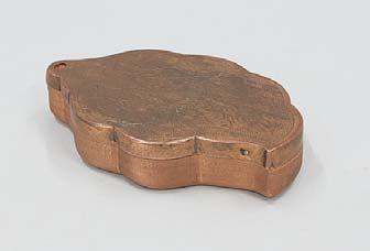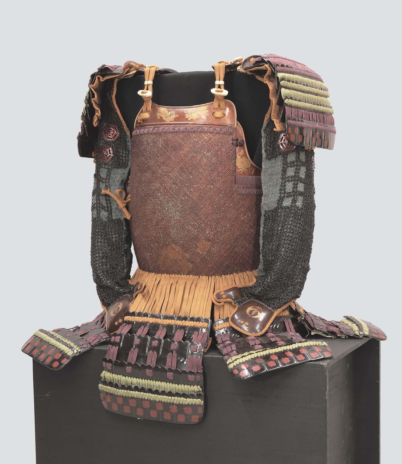 鉄地錆色漆塗六十二間筋兜付本小札二枚胴具足 ¥1,000,000~ 付溜塗太鼓櫃 兜 鉄板六十二枚矧合わせで錆色漆塗とし、長丸に成形して前後 に膨らむ姿形をとる。銘は未確認。八幡座は鍍金裏菊を底と して赤銅菊透、裏菊、素銅宝瓶に玉縁を重ねる。四天鋲、響孔 を穿たず、笠印付鐶を高めに打つ。当世眉庇は打眉、見上皺を 打出して同様に錆色漆をかける。二本角本を短く立てるが後 補が想定され、一本角本用の立物(金工鍬形台の中央に日月 軍配を別作して付し、鍬形を挿す)を装着する。 は鉄切付盛 上札を錆色漆塗(裏黒)として、五段を紺絲で毛引に威し、当 世形に開く。一段目を吹返し、朱叩塗として赤銅の五三桐紋 を据える。肩摺板は威絲と同じ畦目と菱縫一段を飾る。