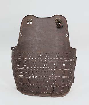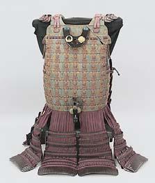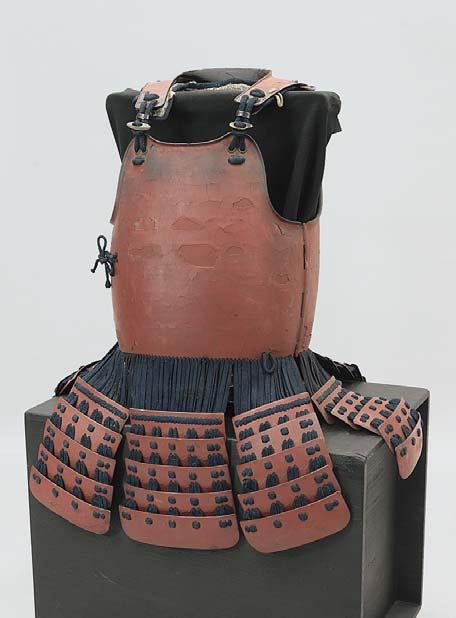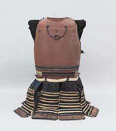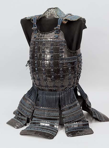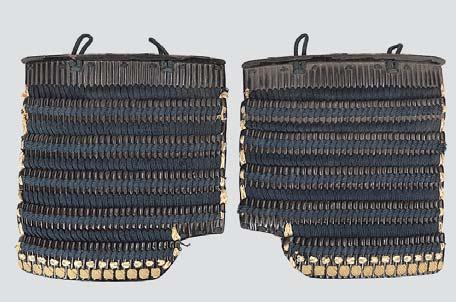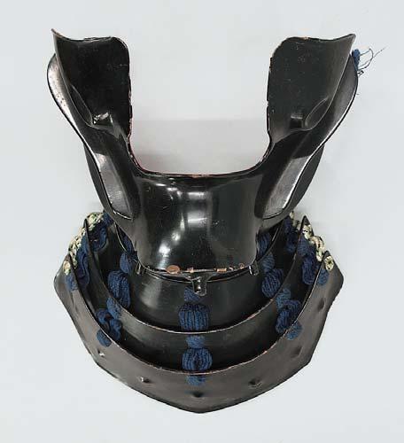 胴 碁石頭に刻んだ板札を前立挙三段、後四段、長側 五段を紺絲素掛威とし二枚胴に構成する。三板、 肩上も同塗素文として凡その飾気を排す。胴前に は鼻紙袋を付し、背は角合当理に受筒、待受、枕を 具える。草摺は練韋六間五段威下げ。