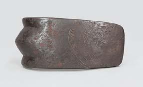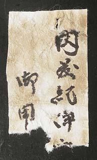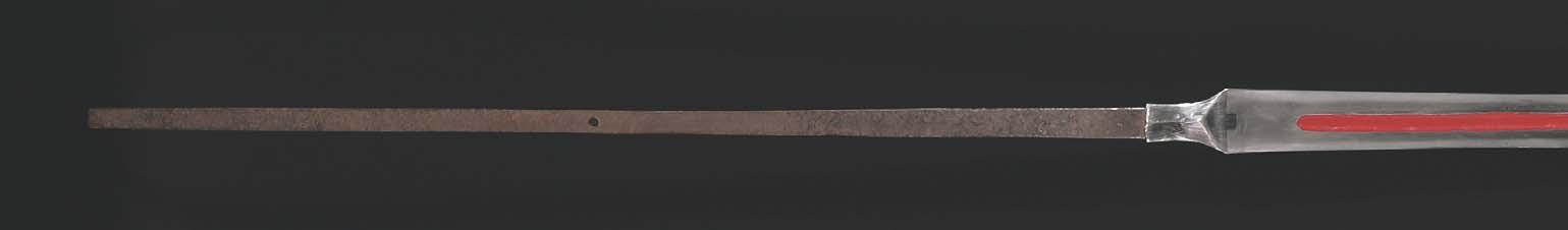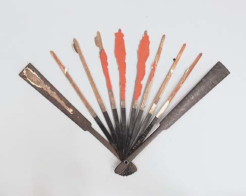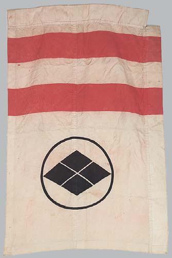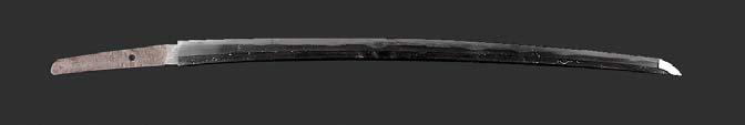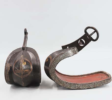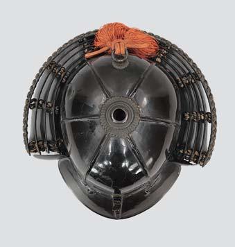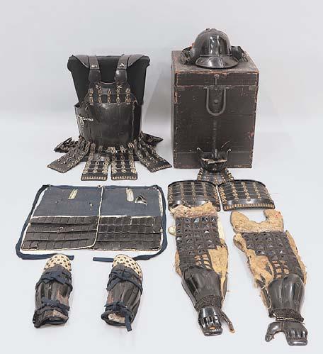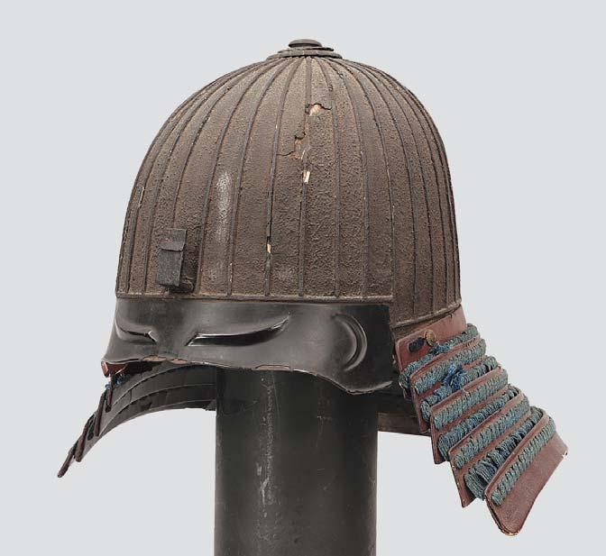 ¥960,000~ 付具足櫃 甲種特別貴重甲冑指定書 兜 鉄板六枚張の鉢金は前正中がやや張出しており、黒漆 がかけられる。金工五段の八幡座と笠印付鐶を具える ほかは飾り気を排す。眉庇も同様に黒漆素文、祓立台を 置いて三光鋲で留める。裏朱。 は鉄五段で素懸に威し、 一段目を吹返して素文とする。総じて漆は損傷、塗改を 散見する。鉢金には弾痕のような窪を一箇所認める。 面具 鉄黒漆塗目下頬。丸い汗抜孔を穿つが、耳の六曜透はな い。四段垂は に通底。面具にも鉢金と同様の損傷をみ る。