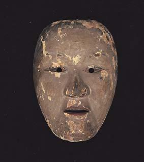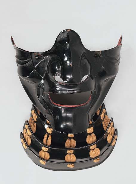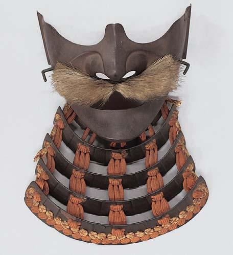 面具 鉄錆色漆塗の烈勢頬。金銅歯、糟毛髭を具え、耳金物 に古様な六曜を透かし、丸い汗抜孔を穿つ。垂は四段、 切付札を紺絲毛引威とする。