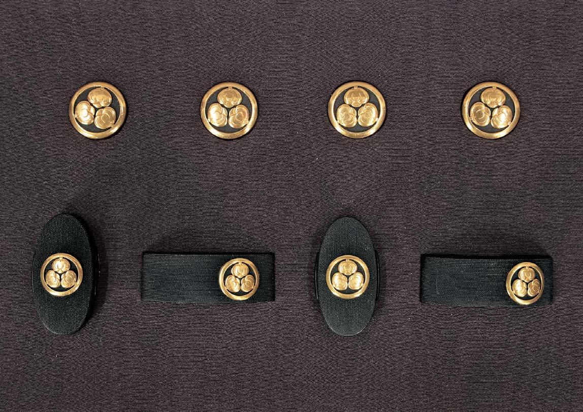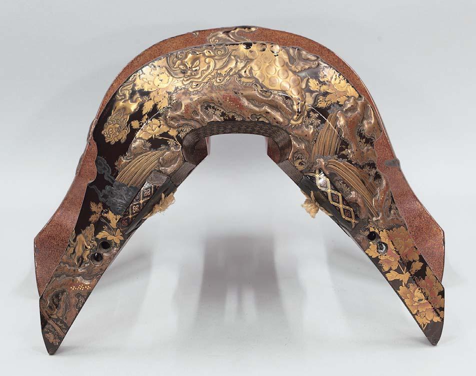 胴 鉄錆漆塗本小札を前立挙三段、後四段、長側五段とし、蝶番で 前後を繋ぐ二枚胴とする。裏面は一面黒革を張る。金具廻り は同じく錆色漆塗の雁木篠、胸板に吹返と同紋を据える。肩 上は切付盛上札三段の小鰭を付し、先端には同据紋の杏葉を 蝶番で繋ぐ。水牛鞐は虫喰。襟廻りは亀甲金を赤羅紗で包み、 紺絲で菱綴して白糸を這わせ韋覆輪する。前立挙二段目に鍍 金菊花座金の手拭付鐶を打ち、背には四分一地菊毛彫座金の 総角付鐶を飾る。合当理を取り去った痕跡があり、孔を小桜 鋲で埋めている。草摺も練韋本小札とし、七間五段を腰革付 する。