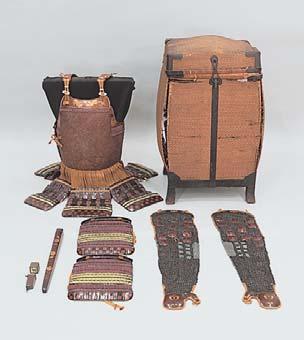 三具 鎬を一つ立てた同塗小篠による籠手と佩楯に、家 地と立挙のない六本篠臑当が添う。
