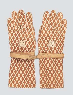 三具 縹地花文錦の家地は、手甲に花文切鉄を添えた錆色漆塗皺瓢 籠手と、鉄同塗の小篠佩楯に共通する。佩楯は獅子牡丹絵韋 を蛇腹伏した一文字と力韋を充て、踏込式とする。三本筒臑 当の立挙は亀甲金を黒羅紗で包み、紺絲菱綴して萌葱糸を這 わせ、韋覆輪しており、襟廻りとは仕立を異にする。