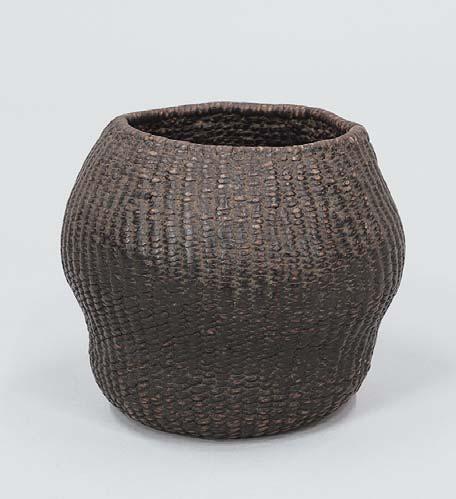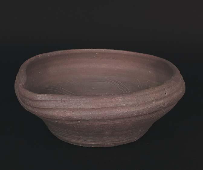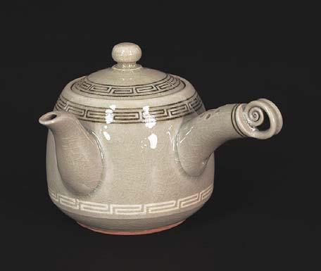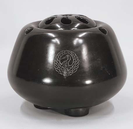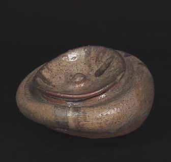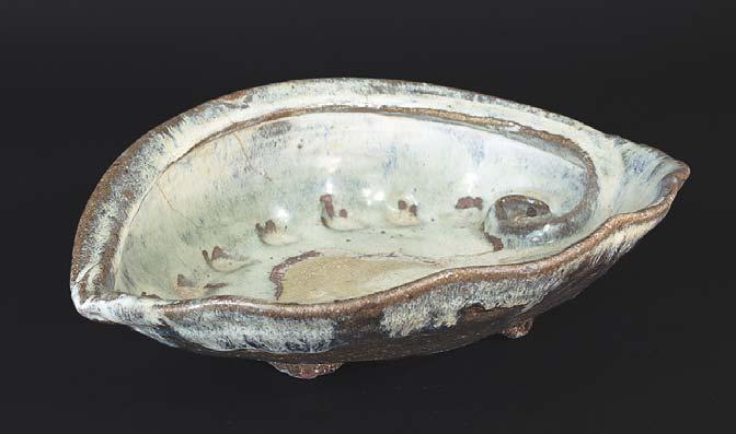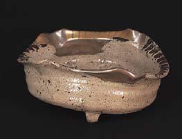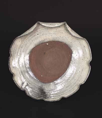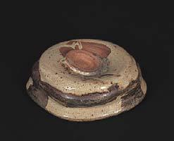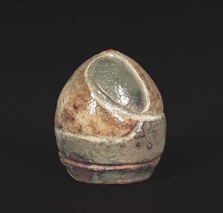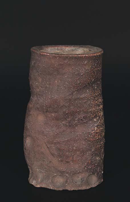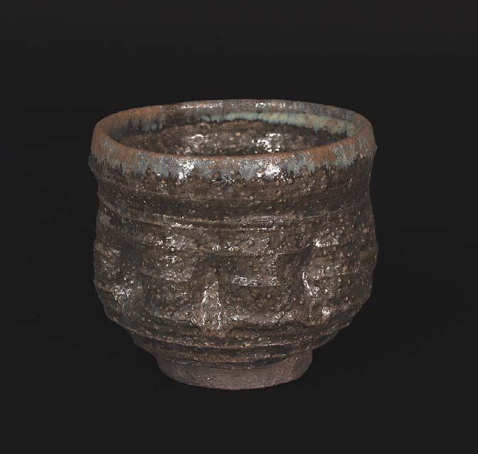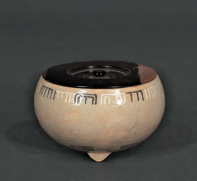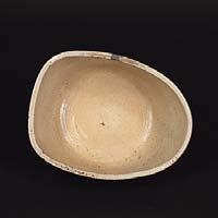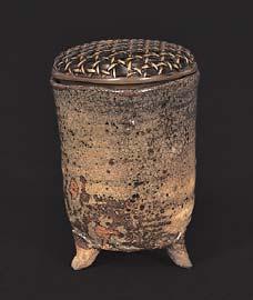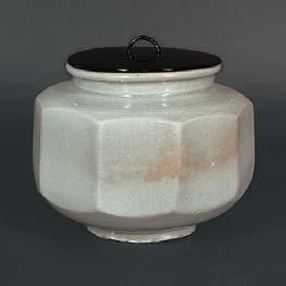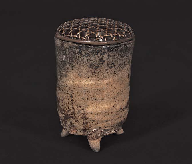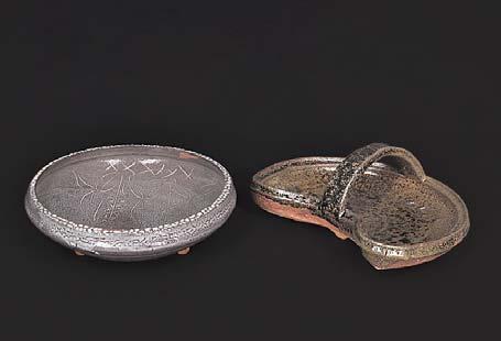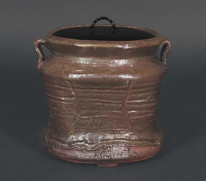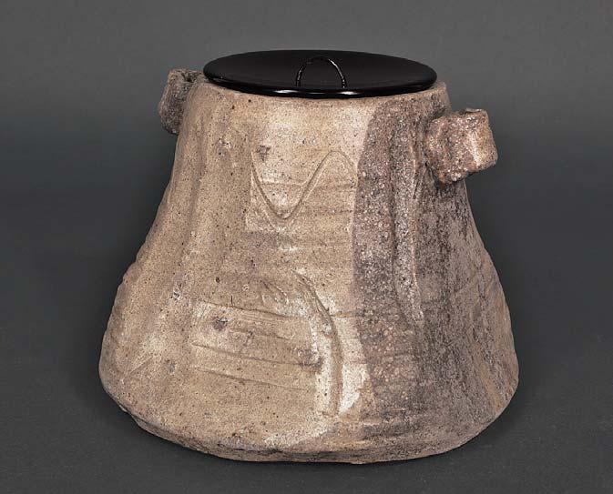 「叩き技法で作られた水指。内部には青海波状の当 て木の跡が残されており、底部は平底で小さな足が三 方に付く。叩きの技法で基本的な形をつくるが、さら に器形を意図的に歪め、線彫り等の装飾を加えている。 (後略)」